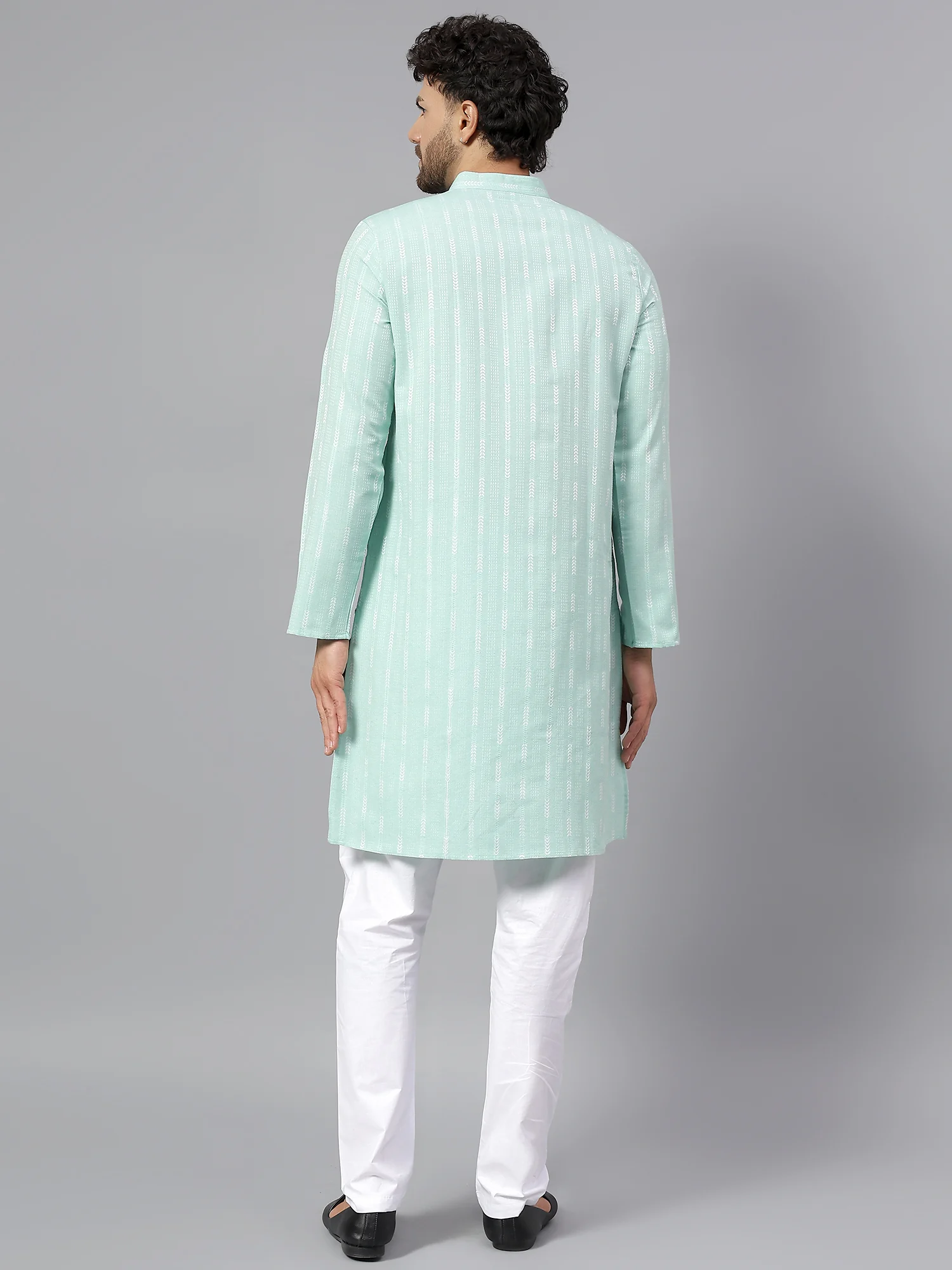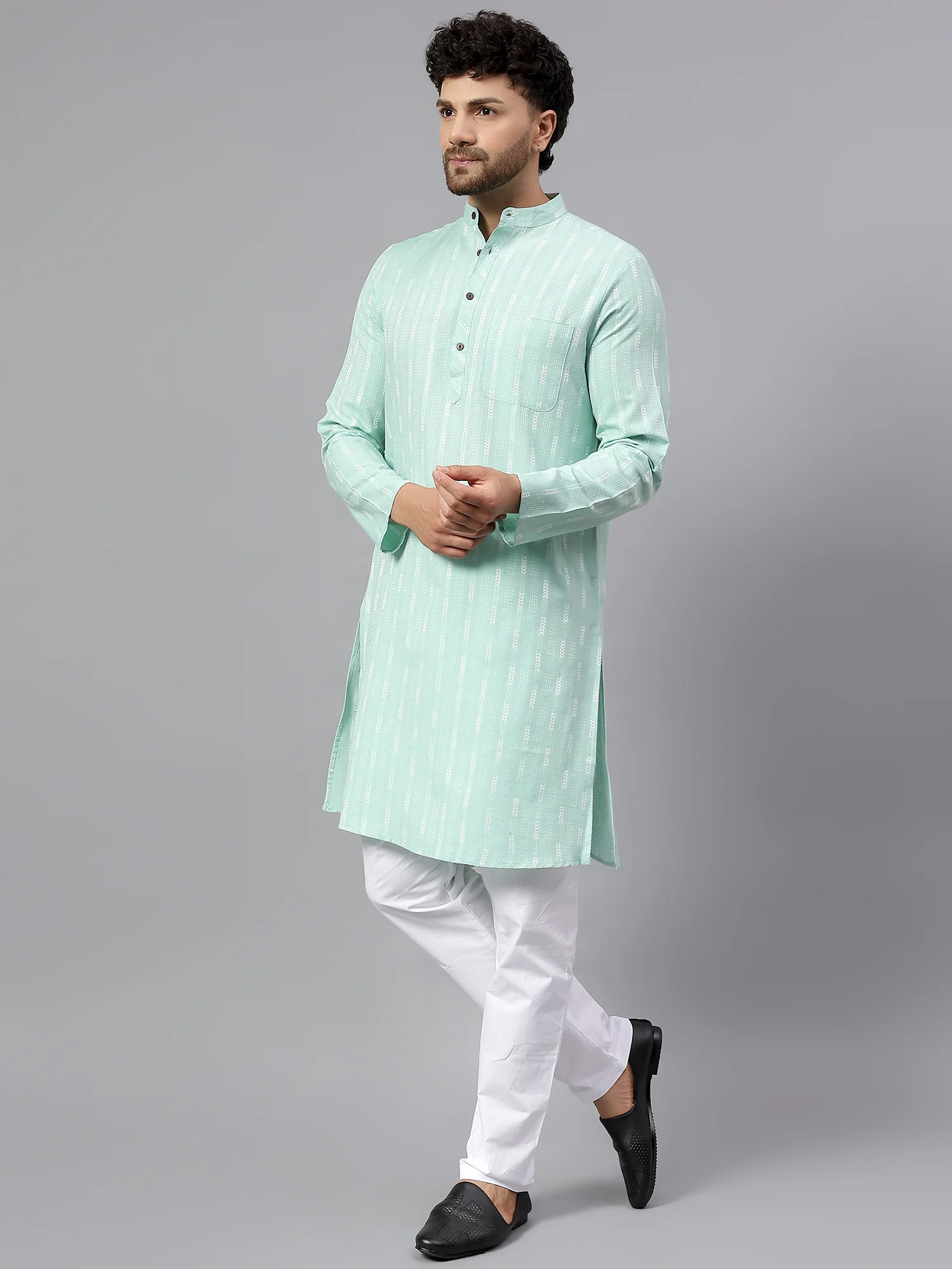 Add a refreshing splash of style to your ethnic wardrobe with this Men’s Mint Green Printed Cotton Kurta. Crafted from soft and breathable cotton, this kurta is designed for all-day comfort while exuding traditional charm. The light mint green hue, combined with delicate white vertical motifs, offers a soothing yet stylish appeal perfect for daytime functions, casual celebrations, and semi-formal occasions.