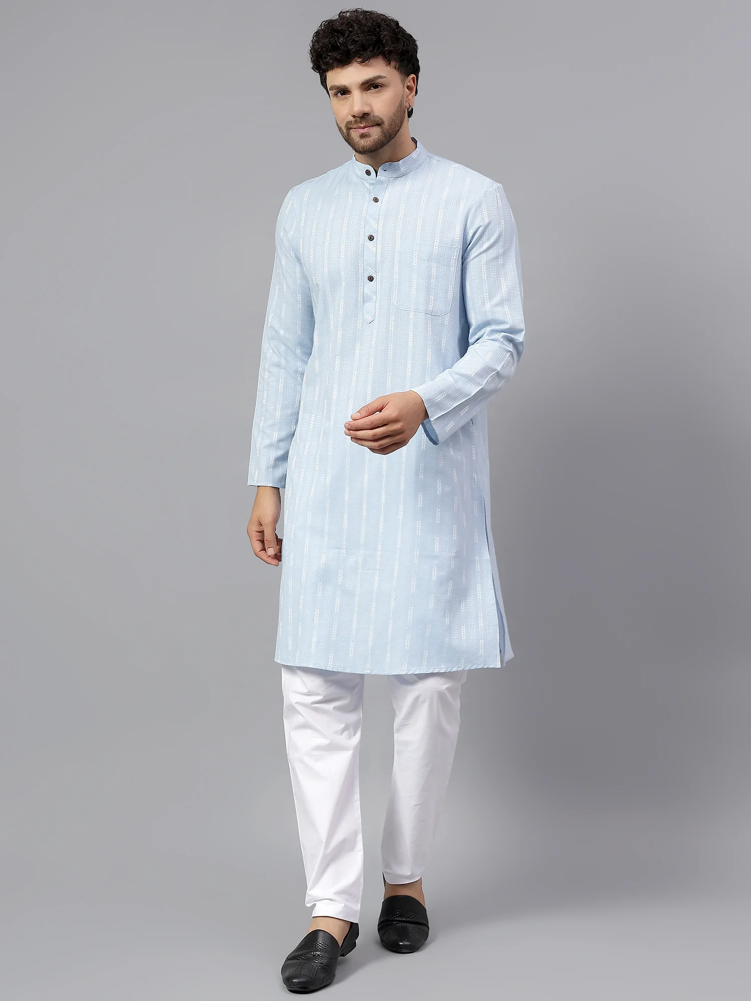 Elevate your ethnic wardrobe with this men’s sky blue printed cotton kurta, designed to bring elegance and comfort together in one timeless piece. Made from high-quality, breathable cotton fabric, this kurta features subtle white woven patterns that add visual texture without being overpowering. The soothing sky blue color brings a cool, calming tone, ideal for daytime events, poojas, and festive wear.