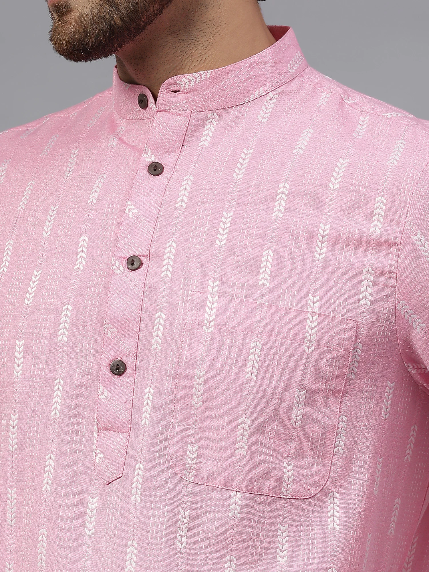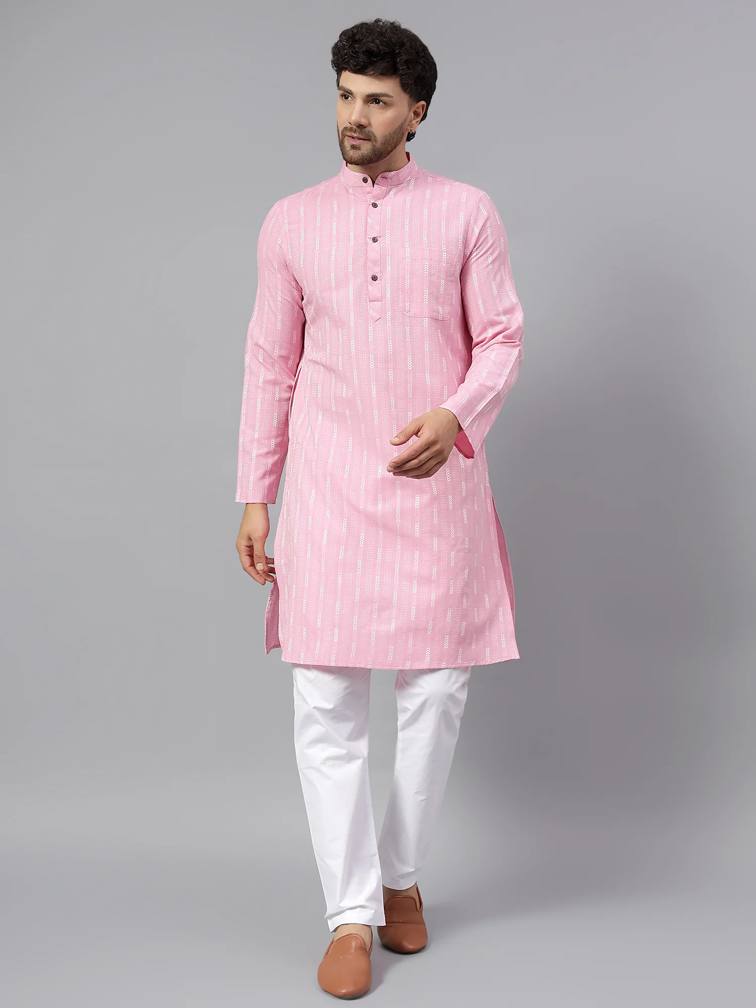 Brighten up your ethnic wardrobe with this Men’s Light Pink Printed Kurta, designed for the modern man who enjoys subtle elegance with a splash of charm. Crafted from breathable and lightweight cotton fabric, this kurta ensures all-day comfort, especially during long celebrations or summer gatherings. The soft pink tone is enhanced with a delicate white printed arrow pattern, adding a youthful and stylish vibe.