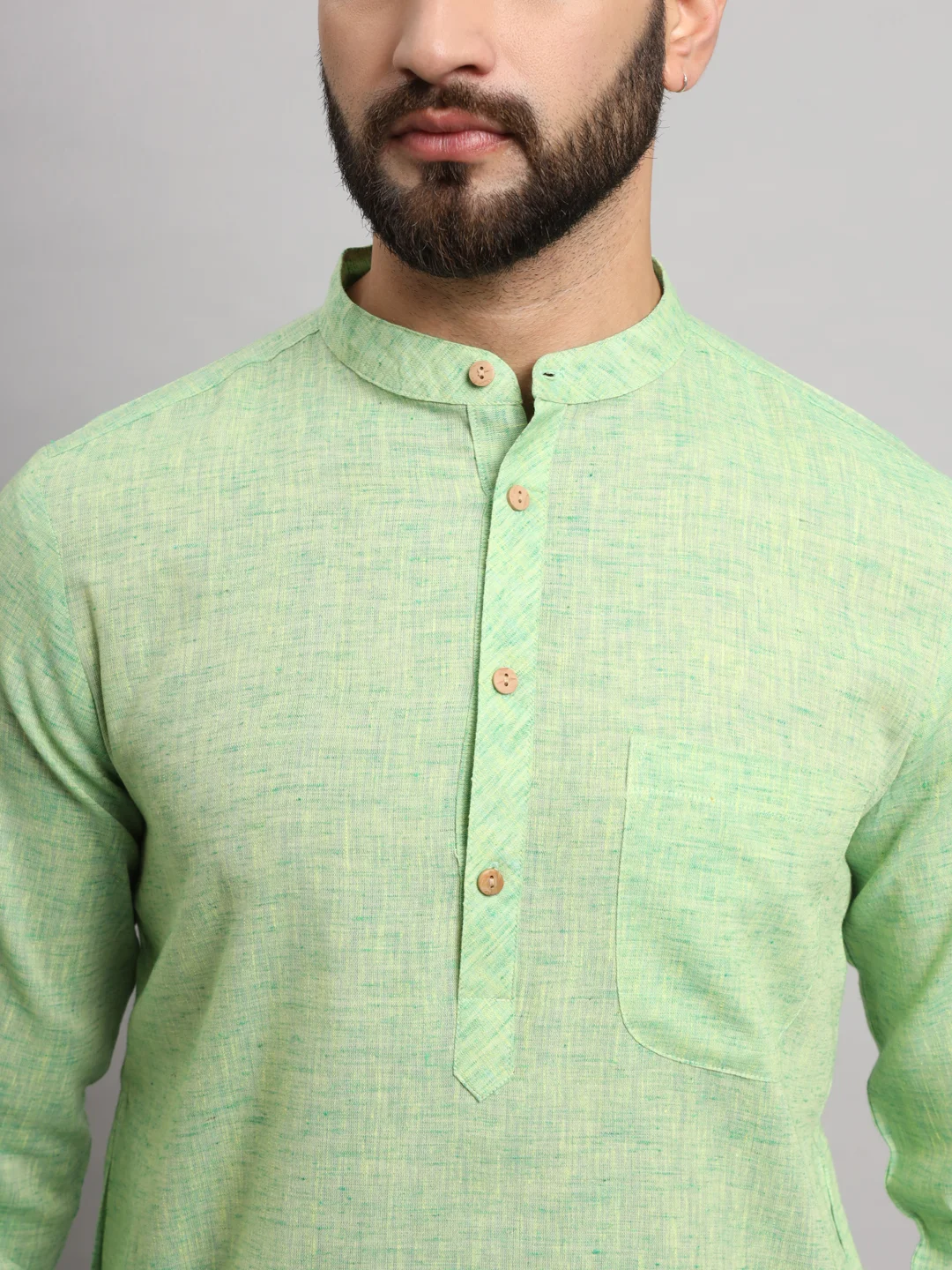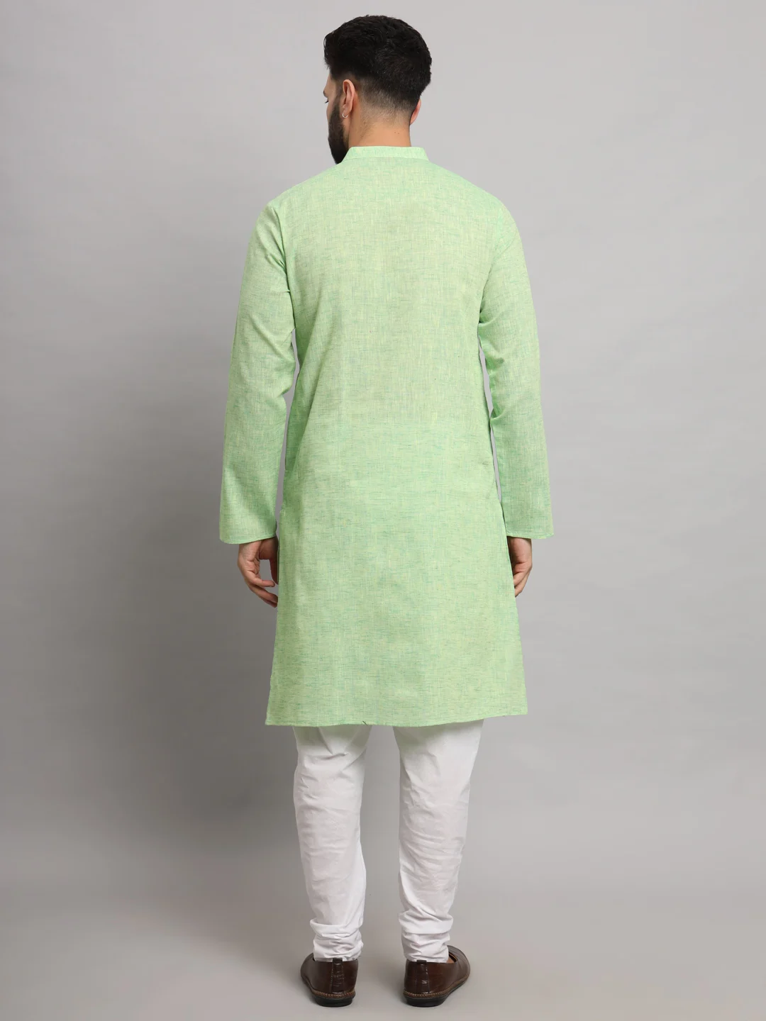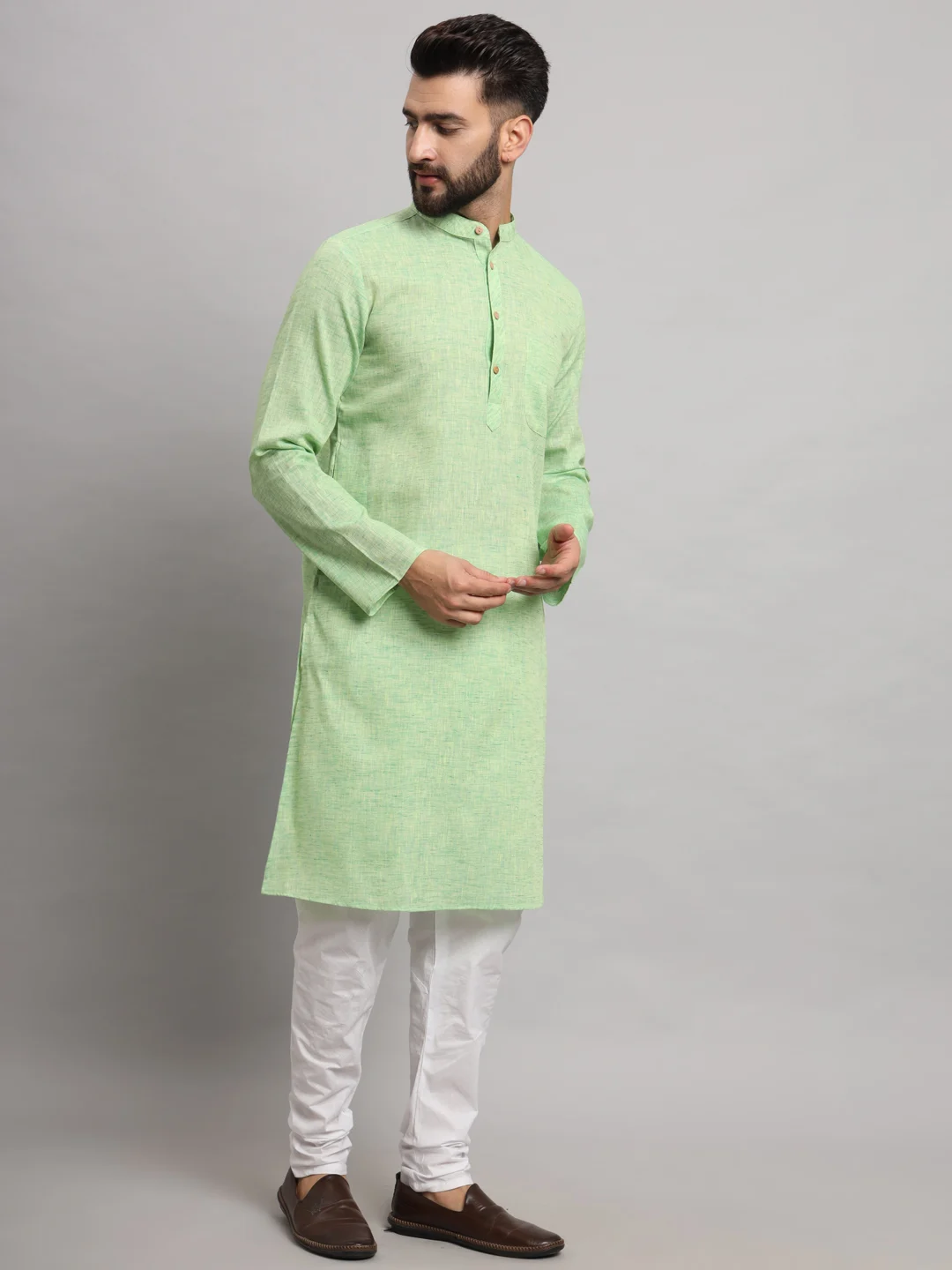 This image shows a man wearing a light green cotton kurta paired with white churidar-style pants. The kurta has a simple, elegant design featuring a mandarin collar, a short button placket with wooden-style buttons, and a single chest pocket. The overall look is minimalistic, fresh, and perfect for casual or semi-traditional occasions. The outfit is completed with brown slip-on shoes, giving it a polished yet comfortable feel.