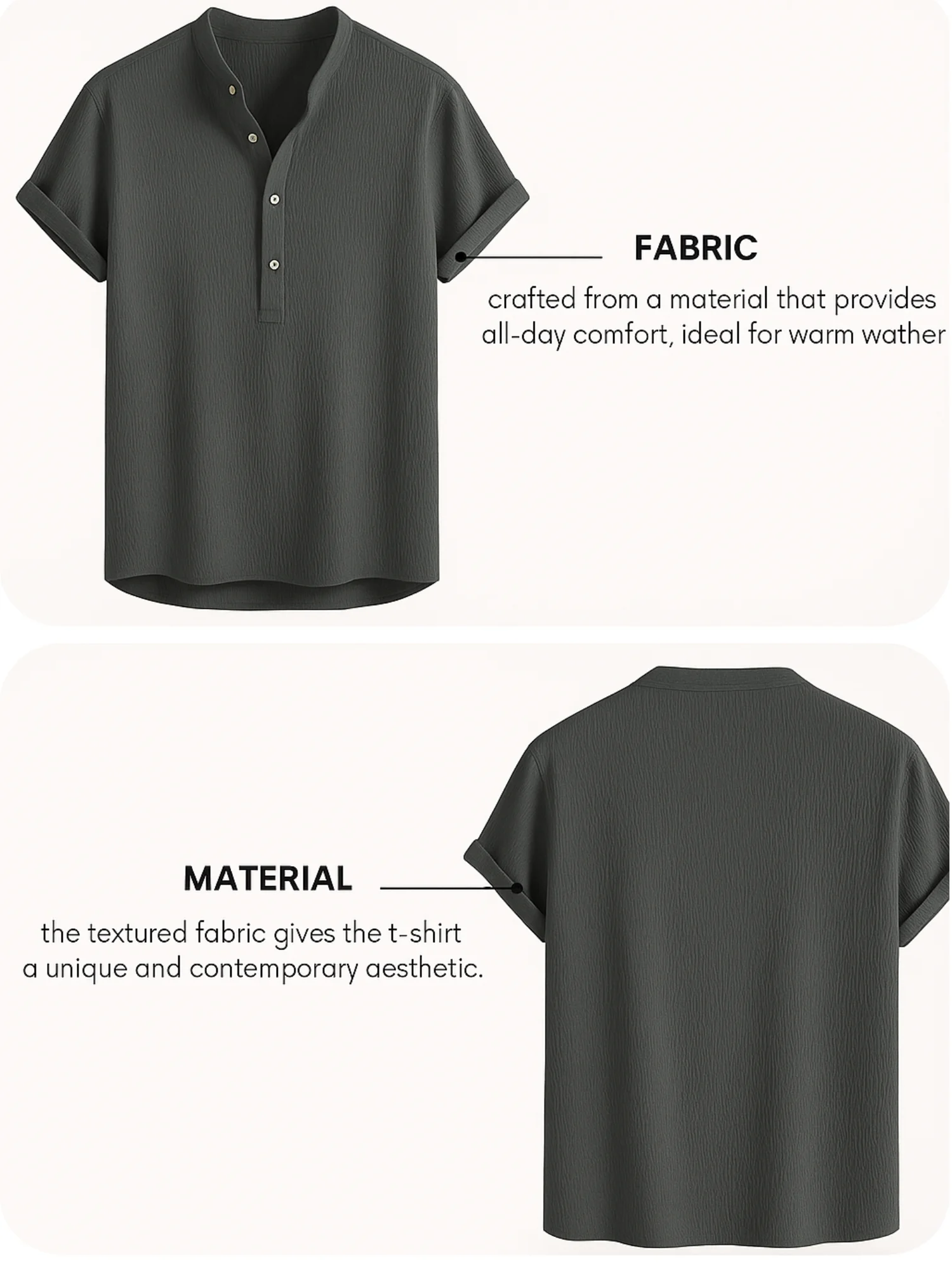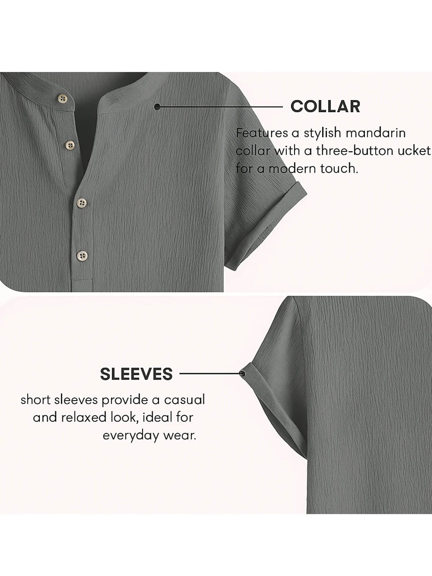 Add a touch of understated elegance to your wardrobe with this Men’s Charcoal Grey Half-Placket Shirt. Made with a breathable cotton-linen blend and subtle crinkle texture, this shirt ensures all-day comfort while keeping you effortlessly stylish. The mandarin collar and rolled-up sleeves give it a contemporary yet relaxed look, perfect for brunches, vacations, or casual Fridays.
