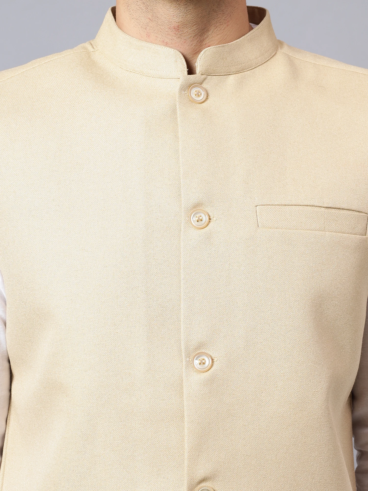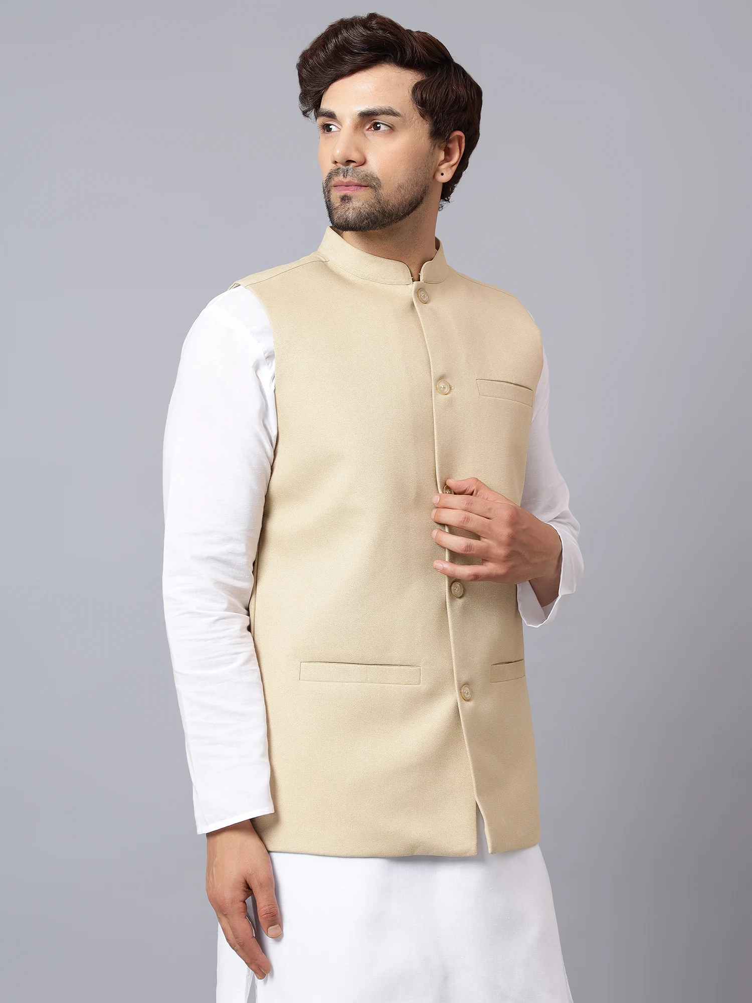 Elevate your traditional wardrobe with this elegant Men’s Cream Beige Nehru Jacket, a timeless piece crafted for versatility and sophistication. Designed with a minimal yet refined aesthetic, this jacket is tailored from premium quality fabric, offering a comfortable fit and a polished look. The soothing cream beige hue gives it a subtle charm, making it ideal for both daytime and evening events like weddings, poojas, office parties, or festivals.