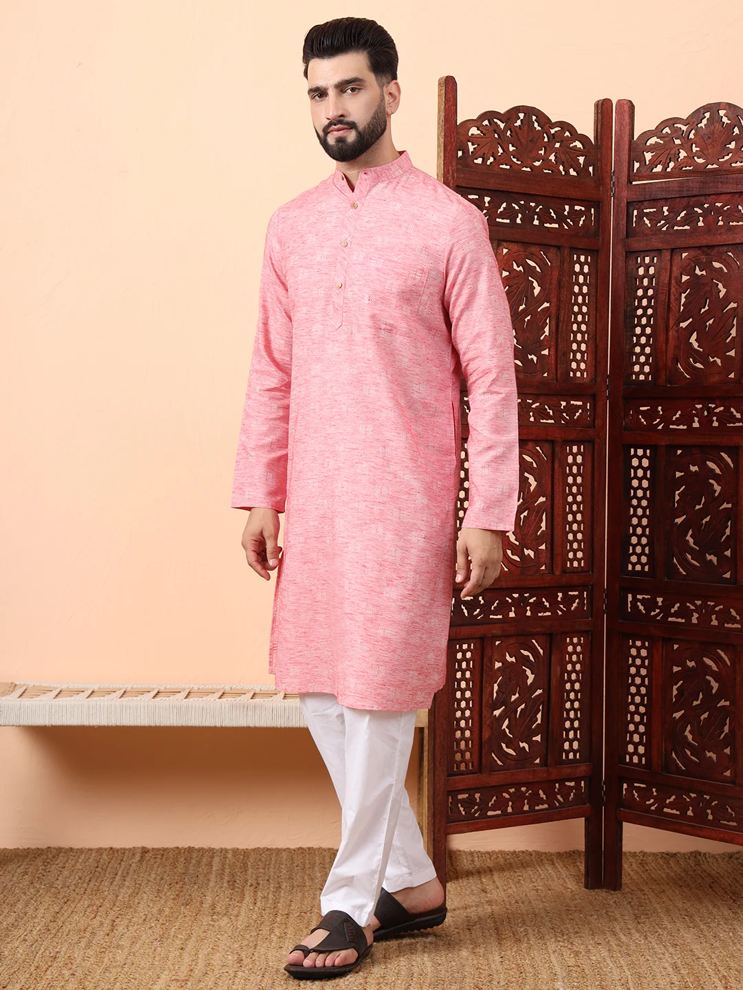 Featuring a Mandarin collar and wooden button placket, the kurta maintains a classic ethnic silhouette while integrating modern design elements. The self-woven thread patterns subtly enhance the fabric’s texture, giving it a refined and elegant finish.