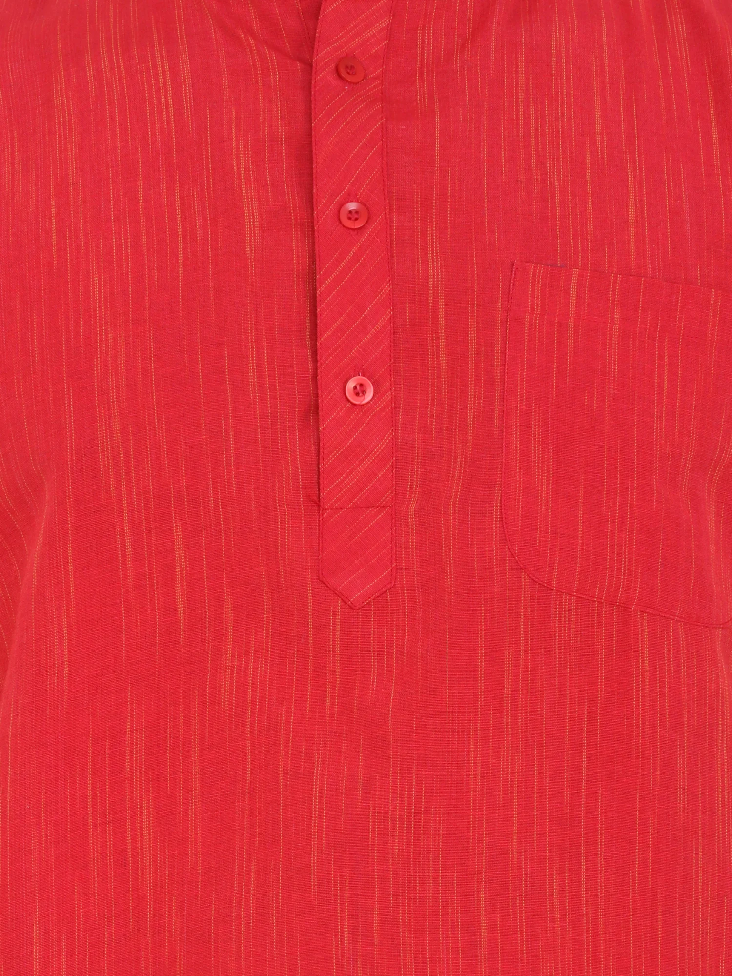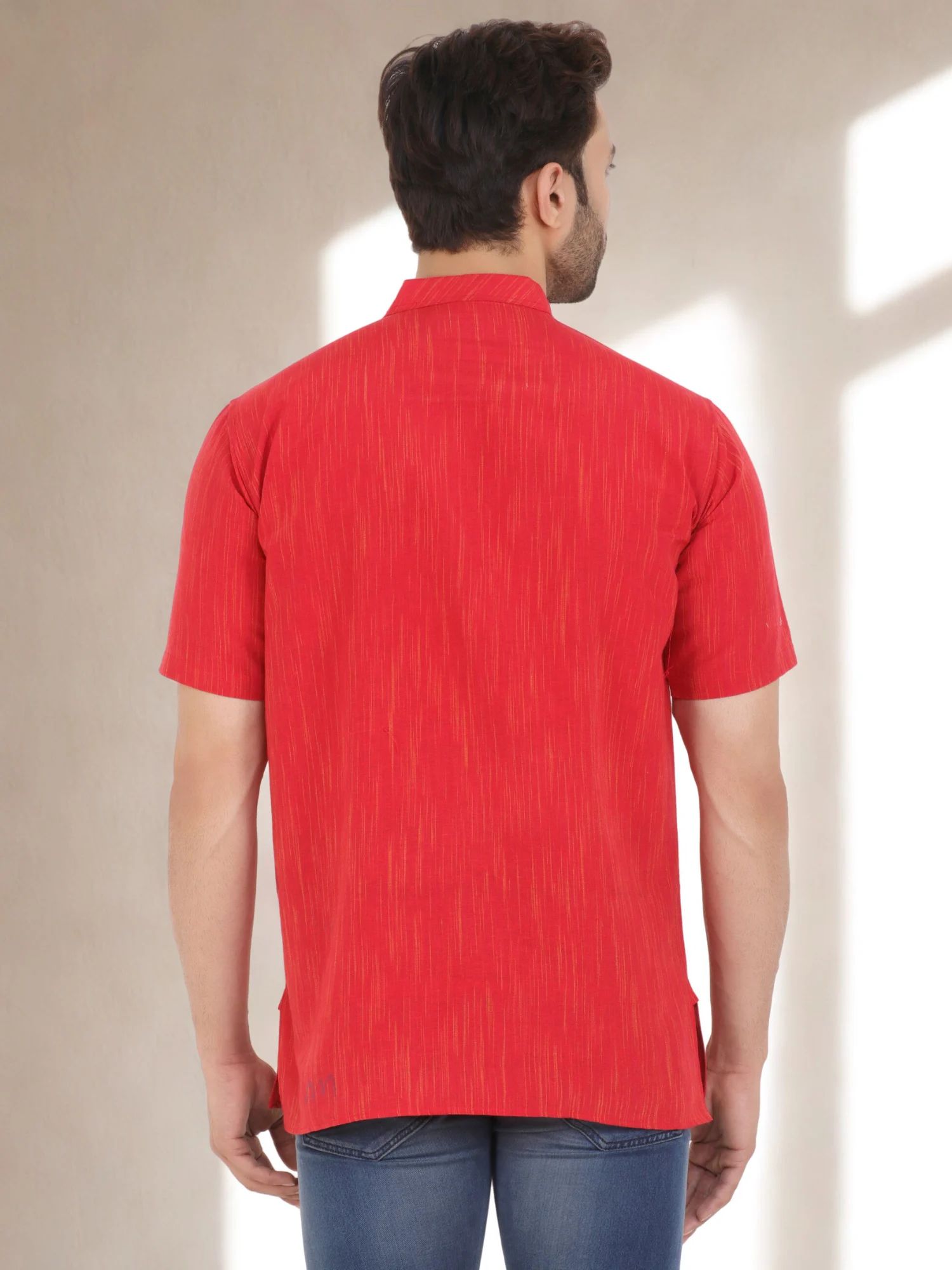 The kurta features a finely textured fabric with a subtle red undertone, giving it a unique visual depth. It includes a stylish Mandarin collar, half-button placket, and a chest pocket for a polished look. The short sleeves and side slits add to its relaxed fit, allowing for easy movement and versatile styling with jeans, trousers, or traditional lowers.
