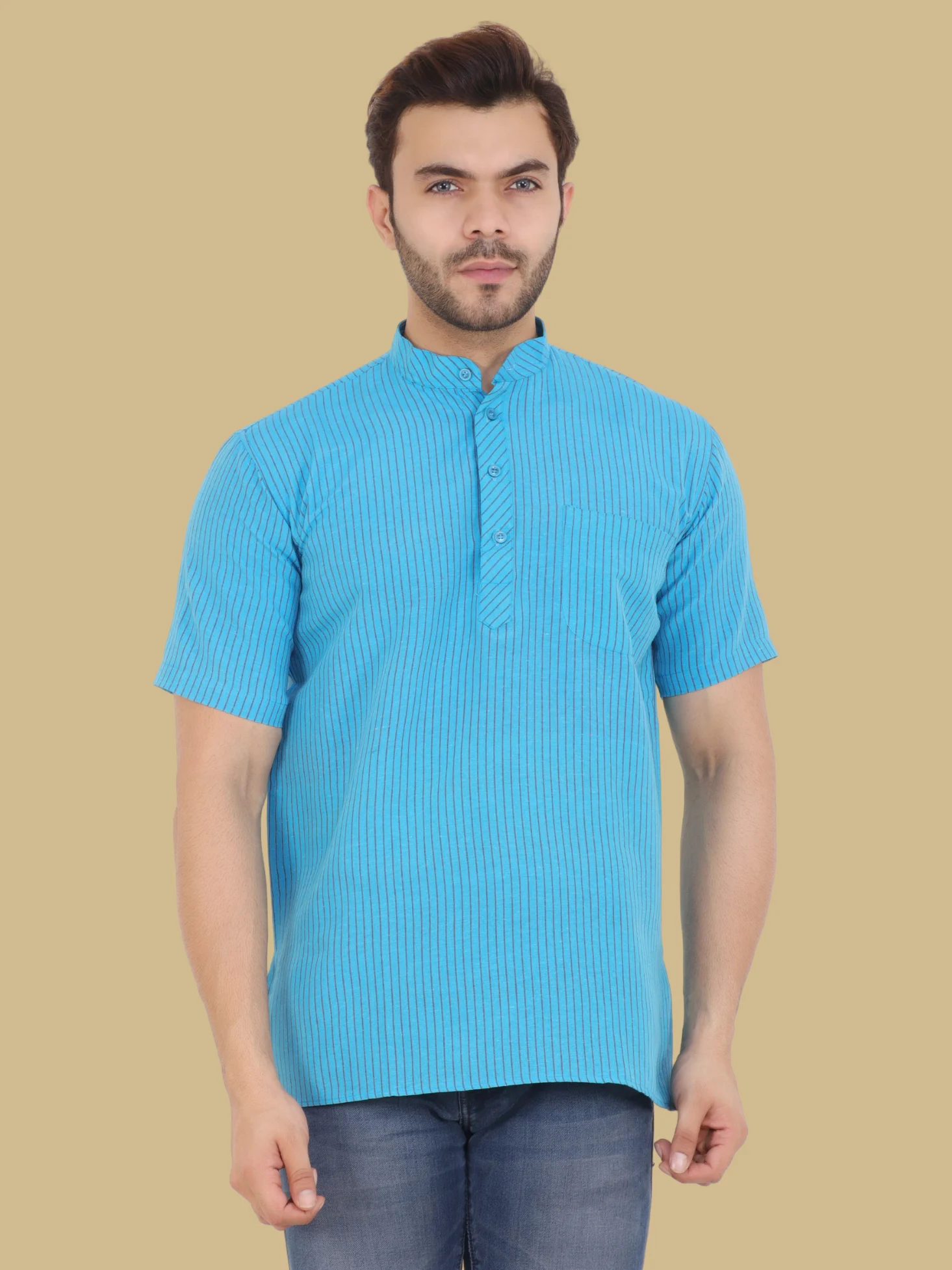 Elevate your ethnic-casual wardrobe with this stylish Men’s Short Sleeve Kurta in a vibrant orange hue. Crafted from breathable cotton, this kurta features a subtle vertical stripe pattern, a smart Mandarin collar, and a half-button placket for a touch of traditional charm. Perfect for festive occasions, casual gatherings, or daily wear, this kurta pairs effortlessly with jeans or traditional pajamas.