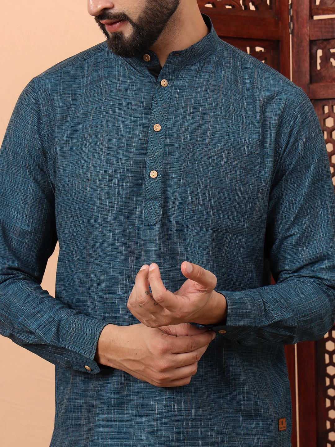 Refresh your ethnic wardrobe with the Hazim Men’s Firozi Khadi Cotton Short Kurta, a perfect fusion of comfort and style. Designed in a rich teal hue with a fine woven texture, this kurta features a smart mandarin collar, wooden button placket, and full sleeves. Made with breathable khadi cotton, it’s ideal for everyday wear, casual gatherings, or festive occasions.