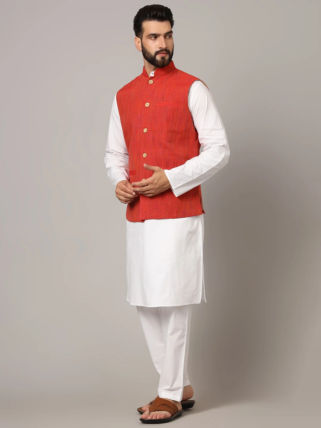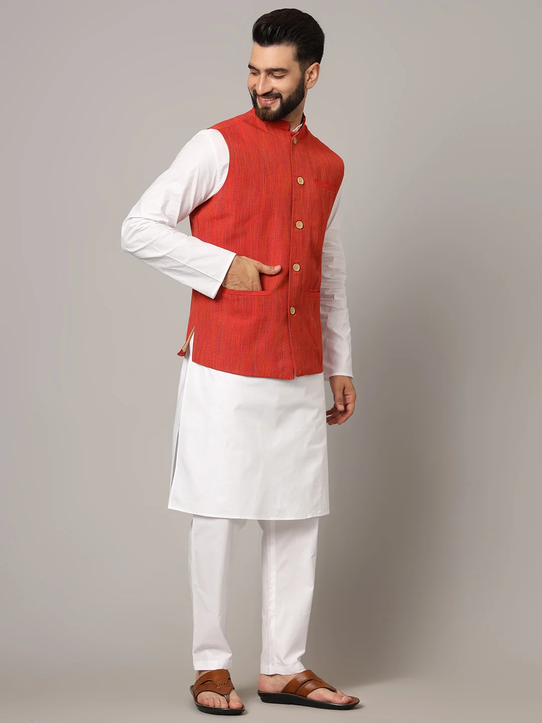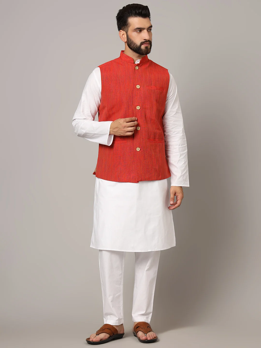 This image features a stylish men’s Nehru jacket from the brand Hazim. Crafted in a rich red textured fabric, the sleeveless jacket boasts a traditional Mandarin collar and wooden buttons for a refined ethnic look. Designed for festive and semi-formal occasions, it is paired with a white kurta-style shirt for contrast. The jacket also includes a welt pocket at the chest and two side pockets for added utility.