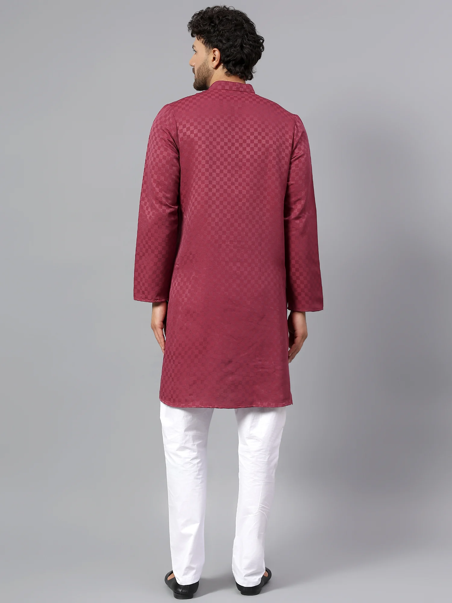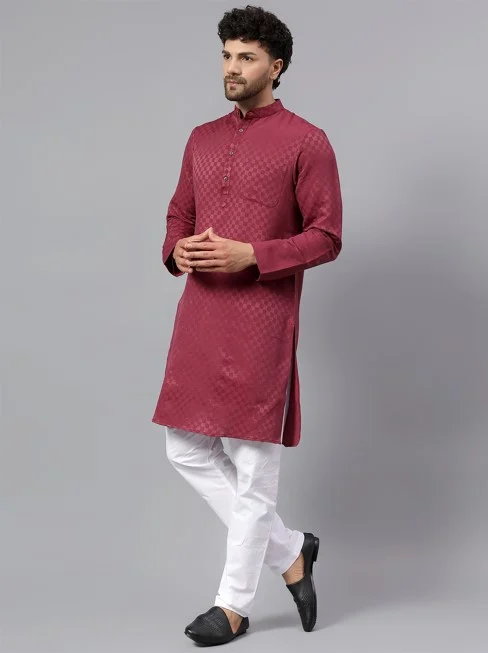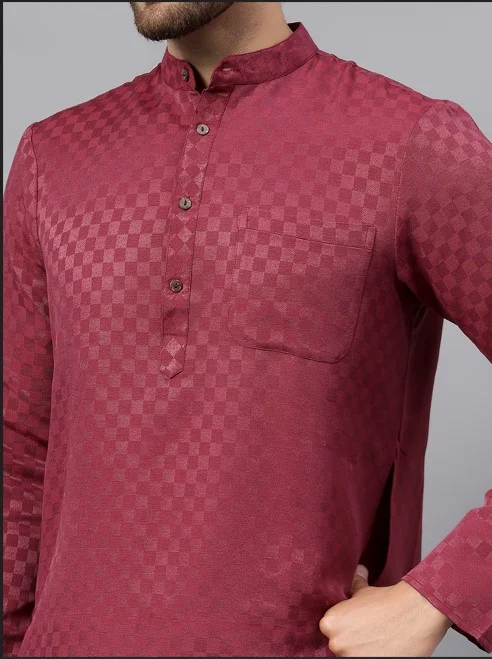Step into the spotlight with this Men’s Maroon Jacquard Kurta, a stunning blend of traditional charm and contemporary finesse. Tailored from high-quality jacquard fabric, this kurta showcases a subtle checkered weave that adds depth and texture to the rich maroon hue. Ideal for weddings, festive celebrations, and cultural events, this kurta delivers a stylish statement without compromising on comfort.