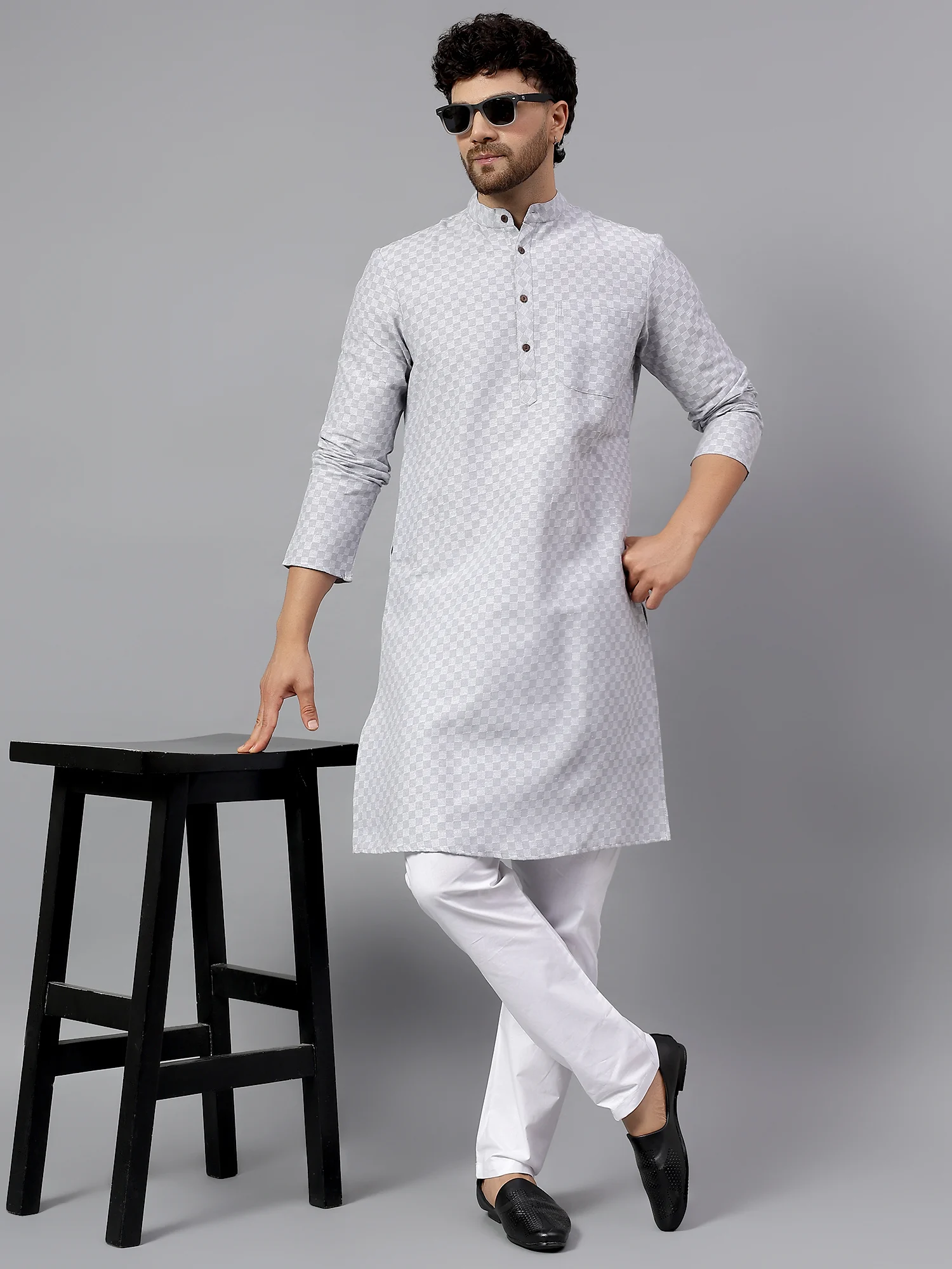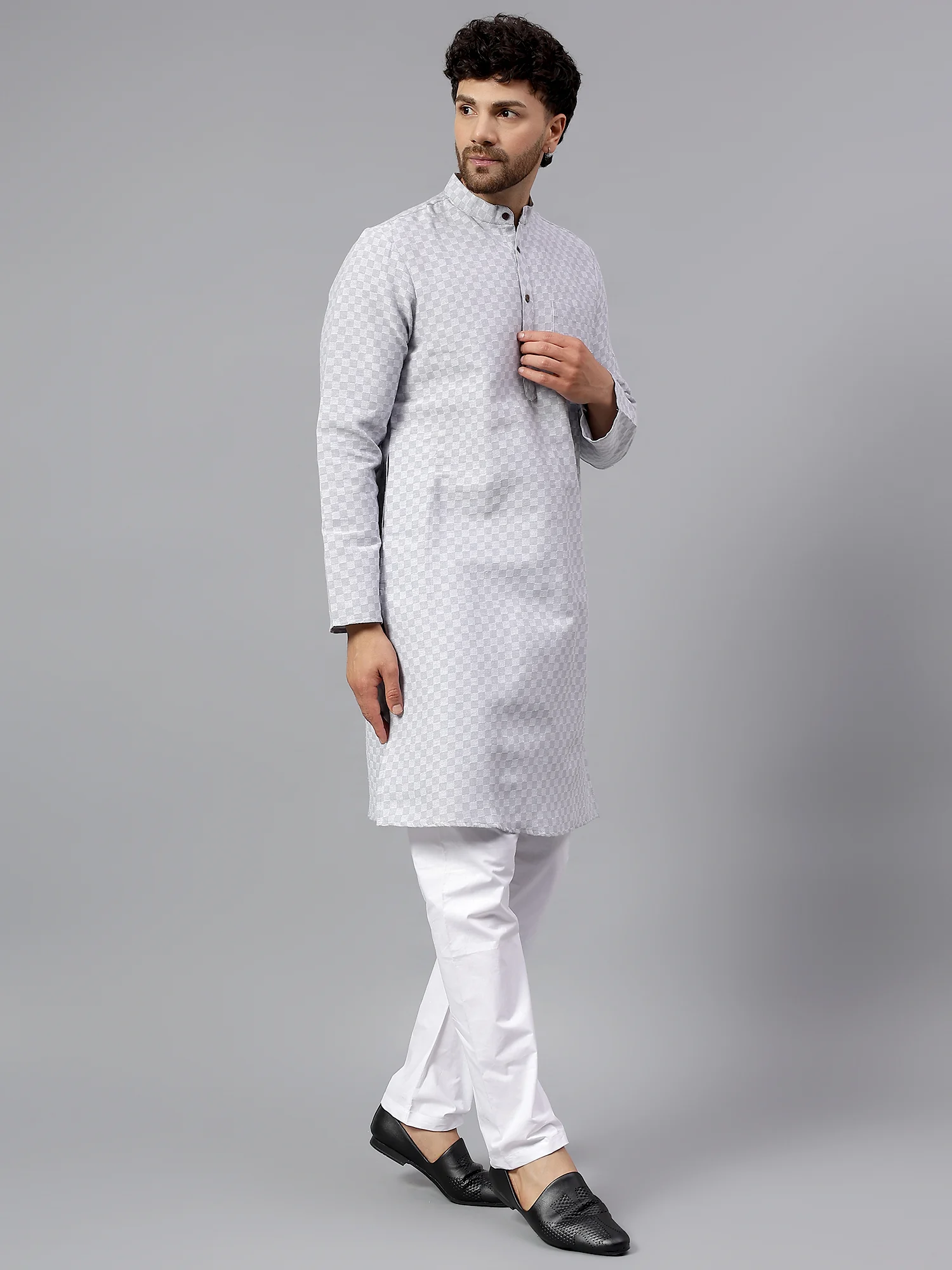 Stay effortlessly elegant with this Men’s Light Grey Jacquard Kurta, a timeless piece crafted to bring sophistication and comfort to your ethnic wardrobe. Made from high-quality jacquard fabric, this kurta features a refined self-checked pattern that adds understated texture to the light grey base. Whether you’re heading to a daytime celebration, festive gathering, or a semi-formal event, this kurta delivers a polished yet relaxed look.