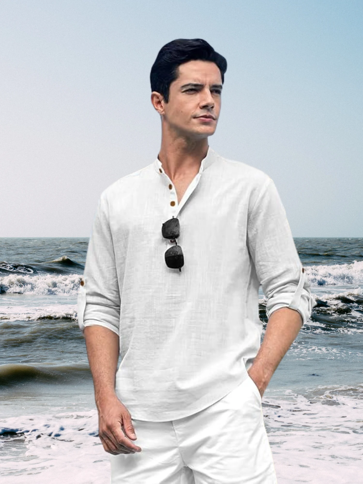 Elevate your casual summer style with this crisp white Mandarin collar kurta shirt from Latest Chikan. Made with a breathable linen-cotton blend, this shirt combines comfort and elegance — perfect for beach days, holidays, casual gatherings, or laid-back weekends. The roll-up sleeves with button tabs add a touch of versatility and charm. Pair it with shorts, chinos, or linen trousers for a smart summer look.