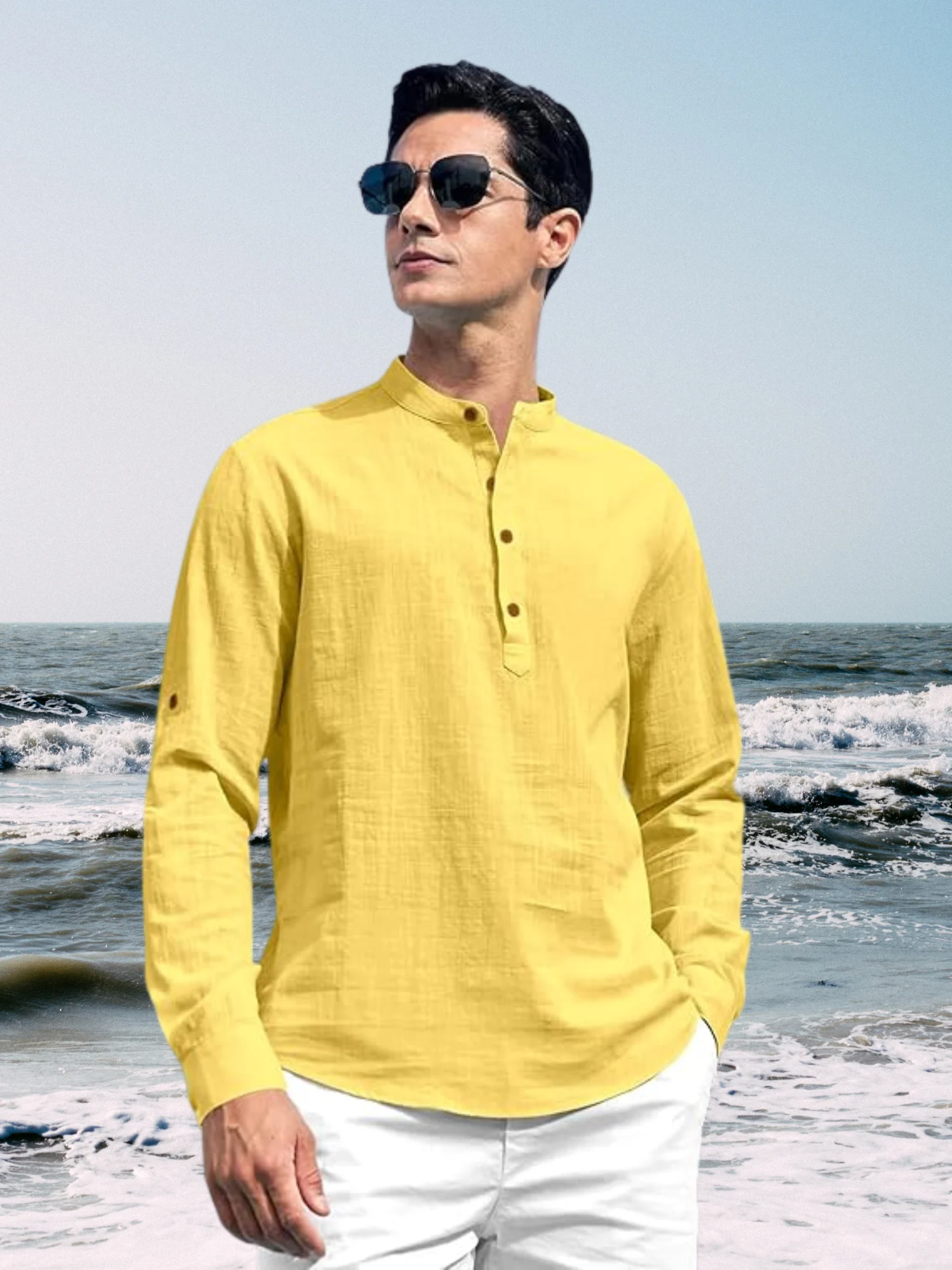 Bring sunshine to your wardrobe with this Men’s Yellow Linen Blend Kurta Shirt — a perfect blend of traditional charm and beachy casual style. Featuring a mandarin collar, half button placket, and roll-up sleeves, it’s ideal for relaxed outings, summer brunches, or coastal vacations. Stay breezy and stylish, wherever you go!