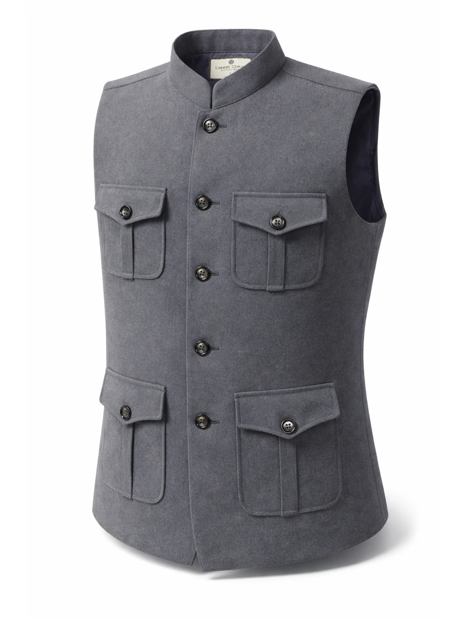 The image shows a well-presented adult man standing upright and facing the camera in a calm, composed manner. He is dressed in a refined, traditional-meets-modern outfit consisting of a Grey Nehru-style vest layered over a crisp white long-sleeve shirt. The vest has a structured silhouette with a band collar, a row of neatly fastened buttons down the center, and four symmetrical flap pockets—two on the chest and two at the waist—giving it a practical yet elegant appearance. The fabric appears textured and well-tailored, suggesting formality and attention to detail.