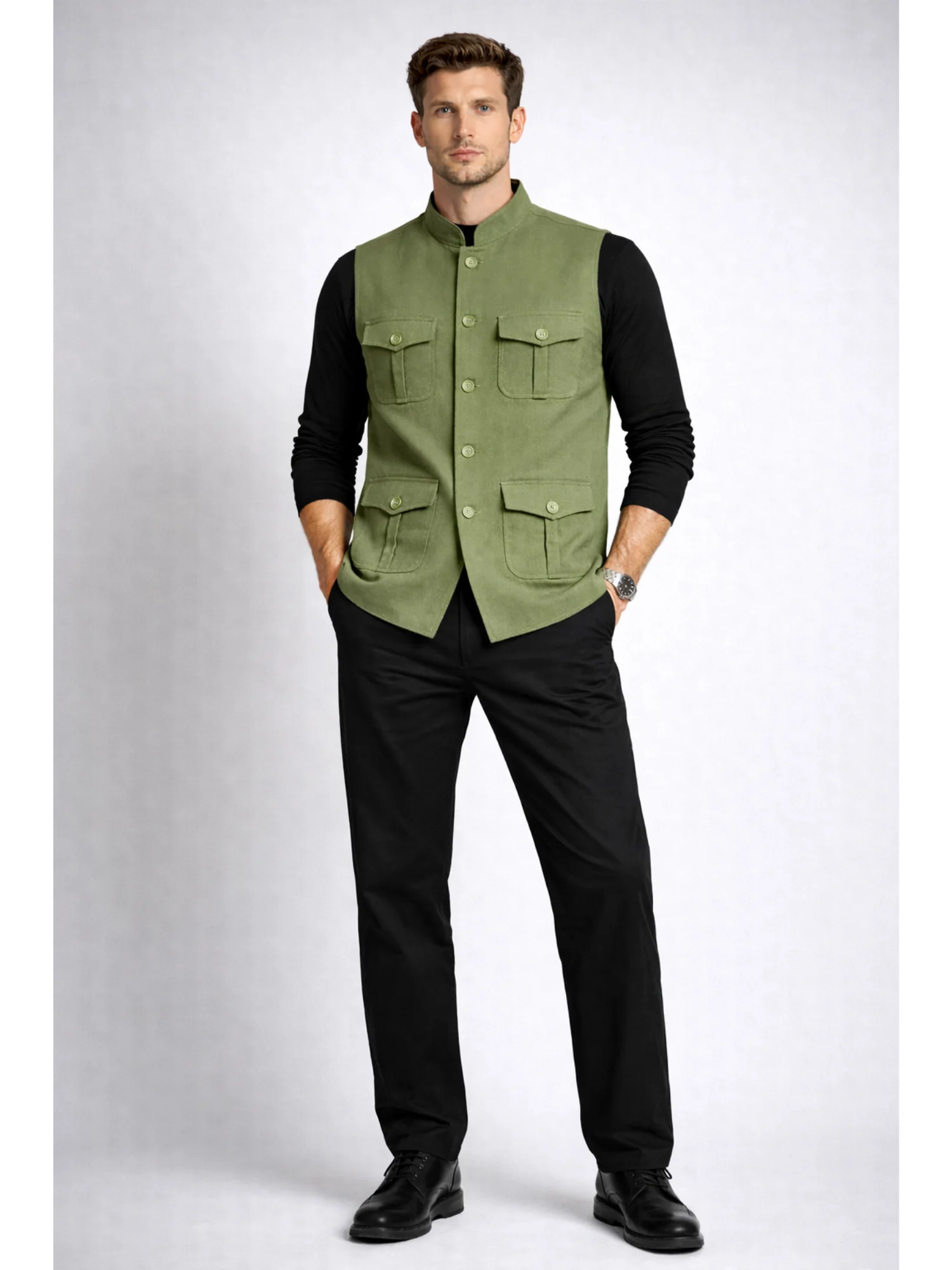 The image shows a well-presented adult man standing upright and facing the camera in a calm, composed manner. He is dressed in a refined, traditional-meets-modern outfit consisting of a Pista Green Nehru-style vest layered over a crisp Black long-sleeve shirt. The vest has a structured silhouette with a band collar, a row of neatly fastened buttons down the center, and four symmetrical flap pockets—two on the chest and two at the waist—giving it a practical yet elegant appearance. The fabric appears textured and well-tailored, suggesting formality and attention to detail.