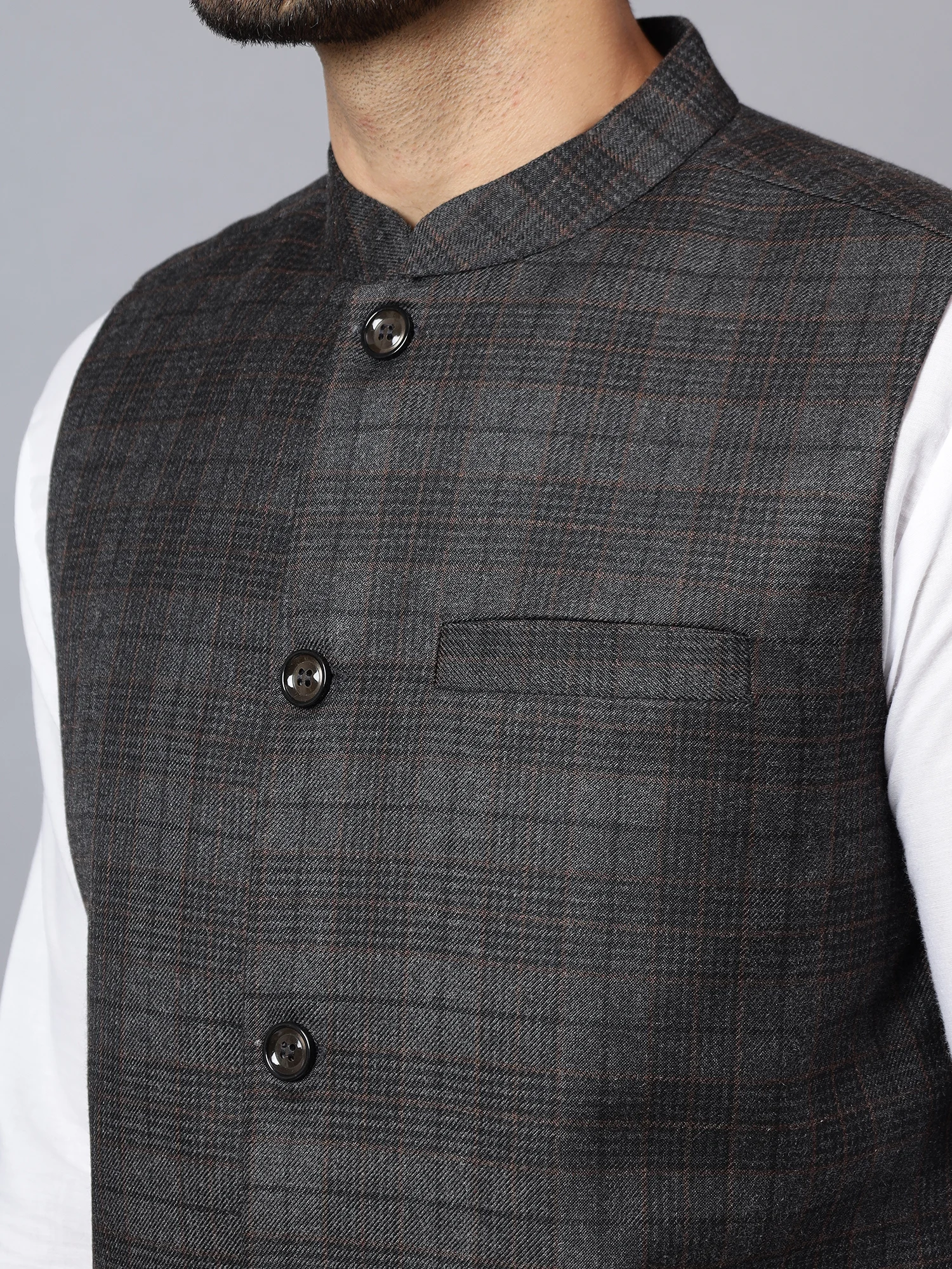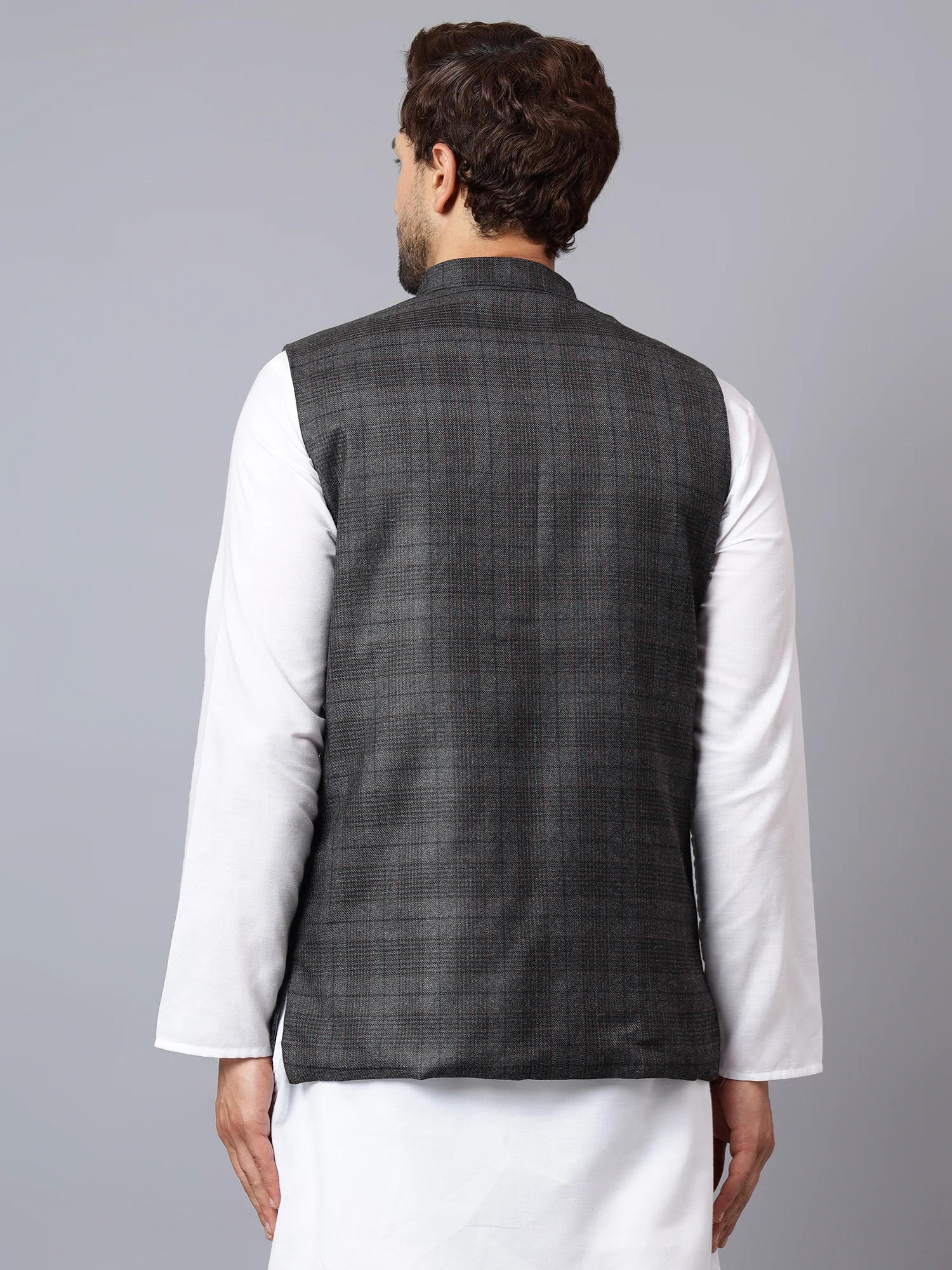 Stay stylishly sharp with this Men’s Grey Checkered Nehru Jacket, a versatile layering piece perfect for both ethnic and Indo-western occasions. Made from a premium suiting fabric, the jacket showcases a classic check pattern in muted charcoal and black tones, ideal for evening functions, office parties, festive get-togethers, and semi-formal events. The mandarin collar and button-down front add a traditional flair, while the structured silhouette gives it a tailored finish. With three welt pockets—one at the chest and two at the waist—you get style and utility in one refined package. Pair it with a white kurta-pajama for a cultural celebration or layer it over a shirt and trousers for a contemporary look.
