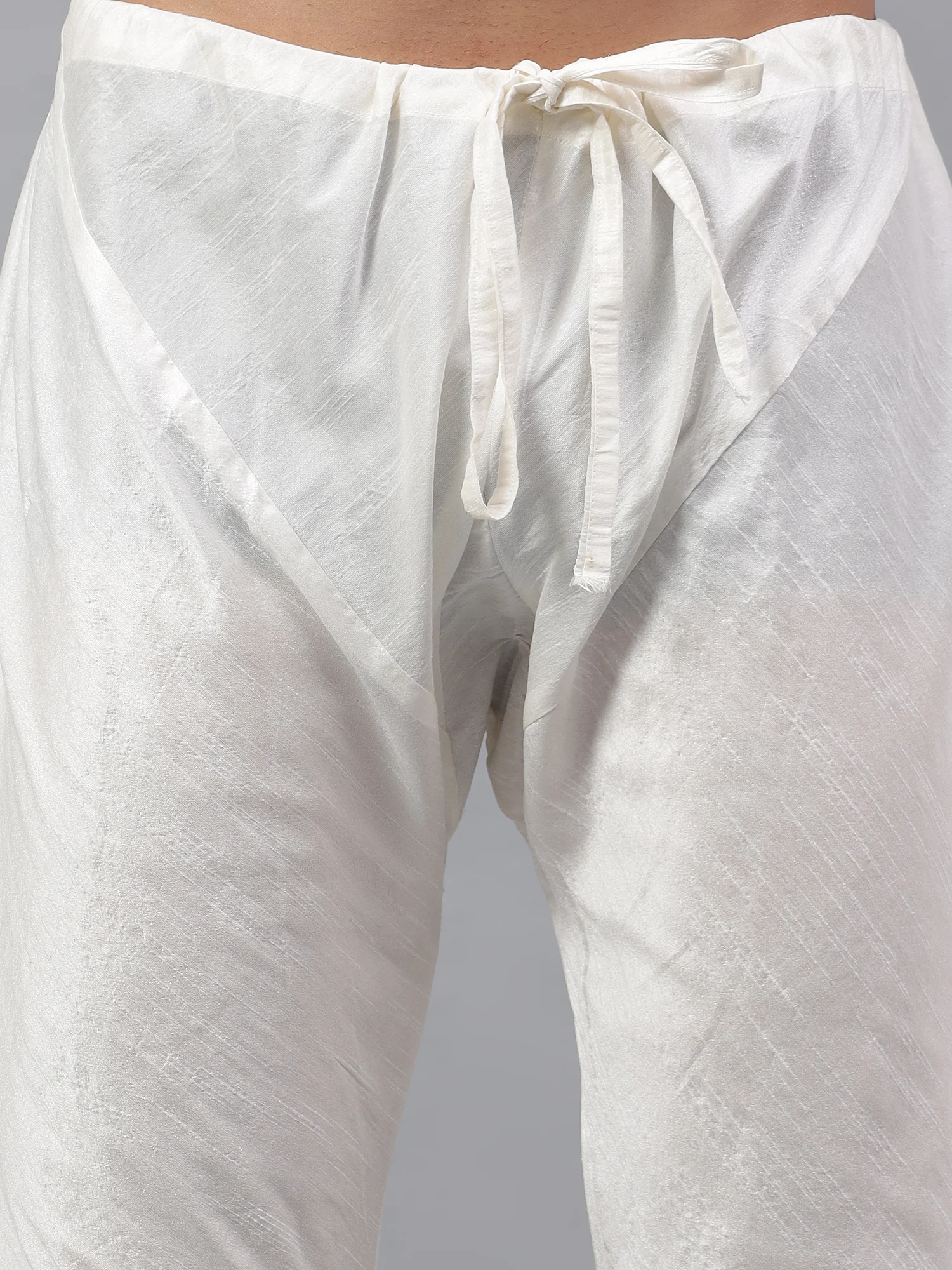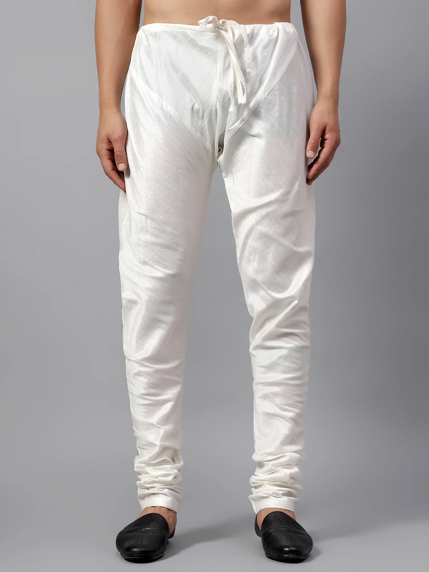 A traditional men’s churidar pajama crafted in shiny Cream silk fabric, designed with a drawstring waist for comfort and a slim fit silhouette perfect for pairing with kurtas or sherwanis.