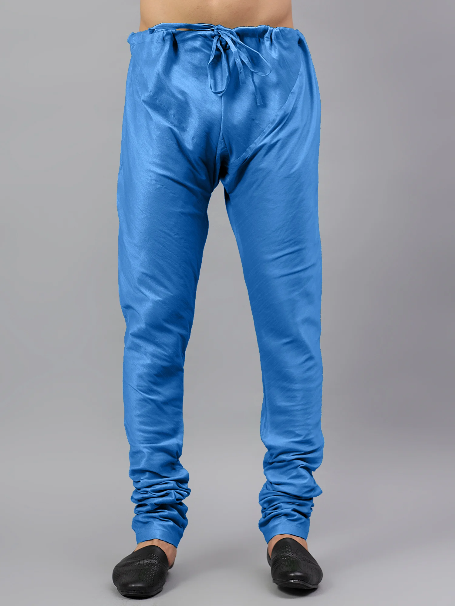 A traditional men’s churidar pajama crafted in shiny Blue silk fabric, designed with a drawstring waist for comfort and a slim fit silhouette perfect for pairing with kurtas or sherwanis.