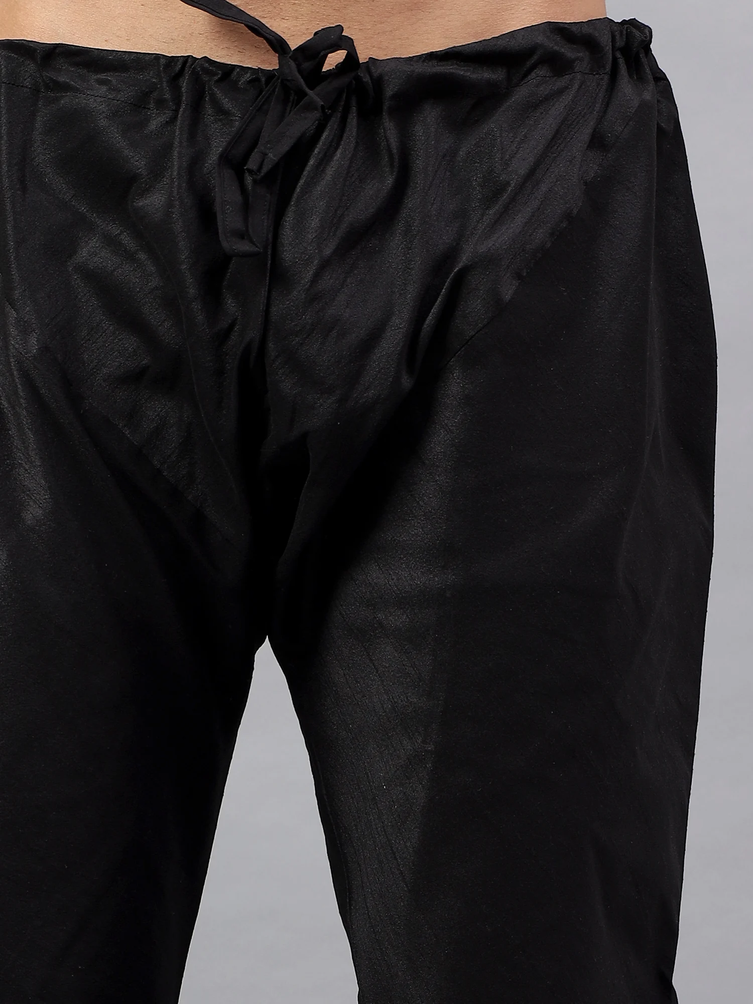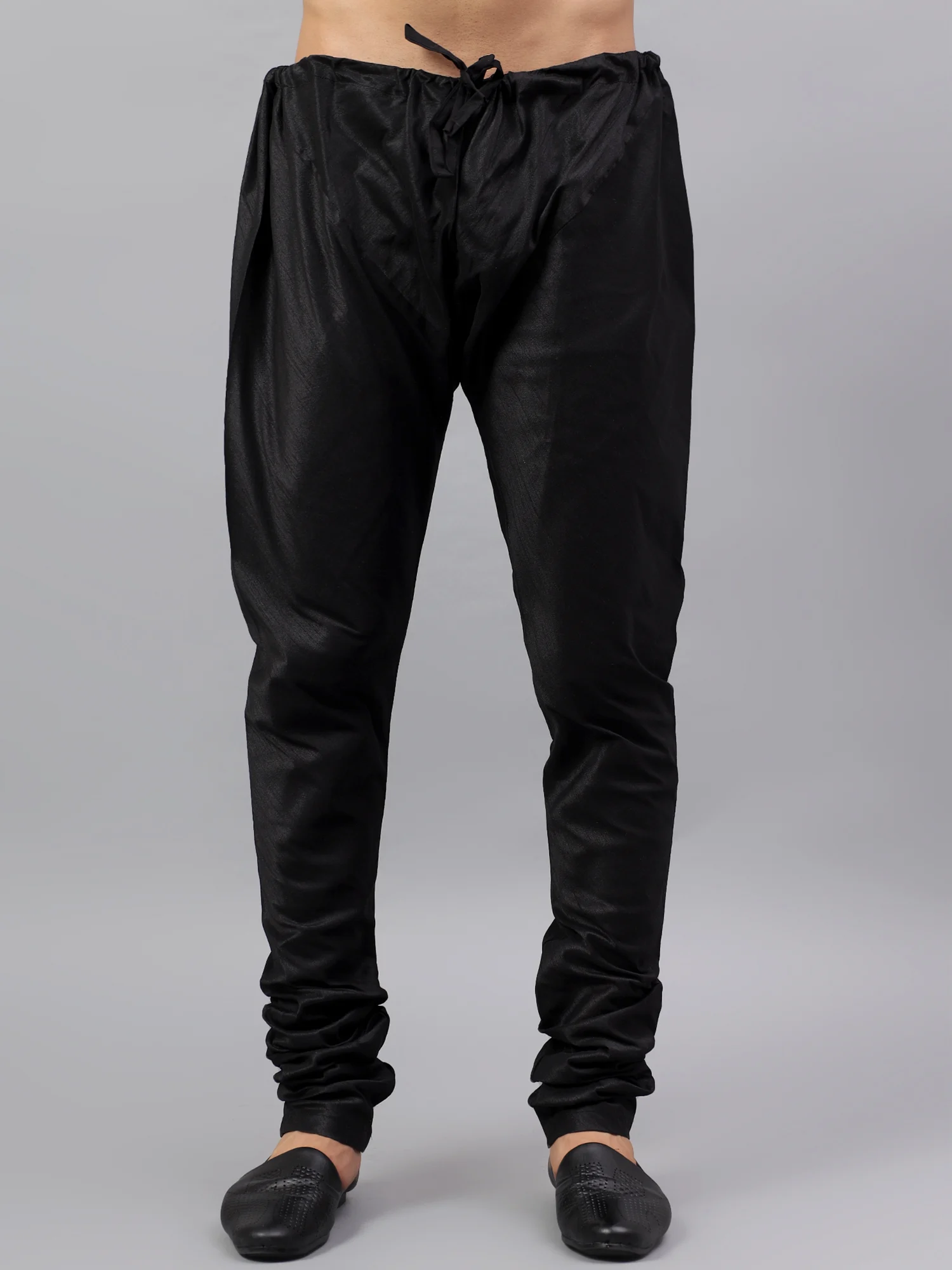 A traditional men’s churidar pajama crafted in shiny Black silk fabric, designed with a drawstring waist for comfort and a slim fit silhouette perfect for pairing with kurtas or sherwanis.