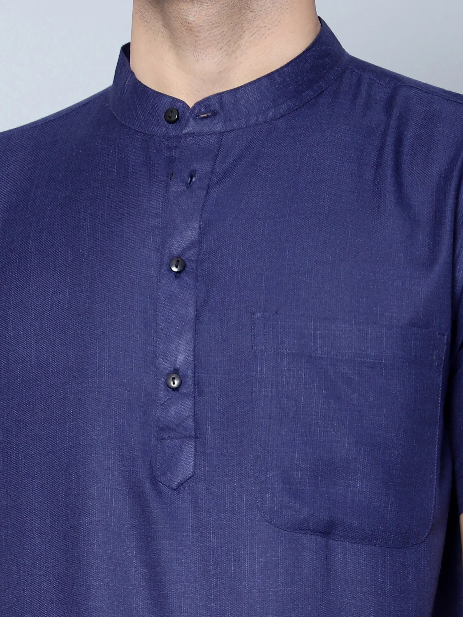 The kurta features a classic Mandarin collar, short sleeves, and a half-button placket, giving it a modern ethnic edge. The rich navy blue color adds a sense of elegance and versatility, making it suitable for festive gatherings, casual outings, or semi-formal events.