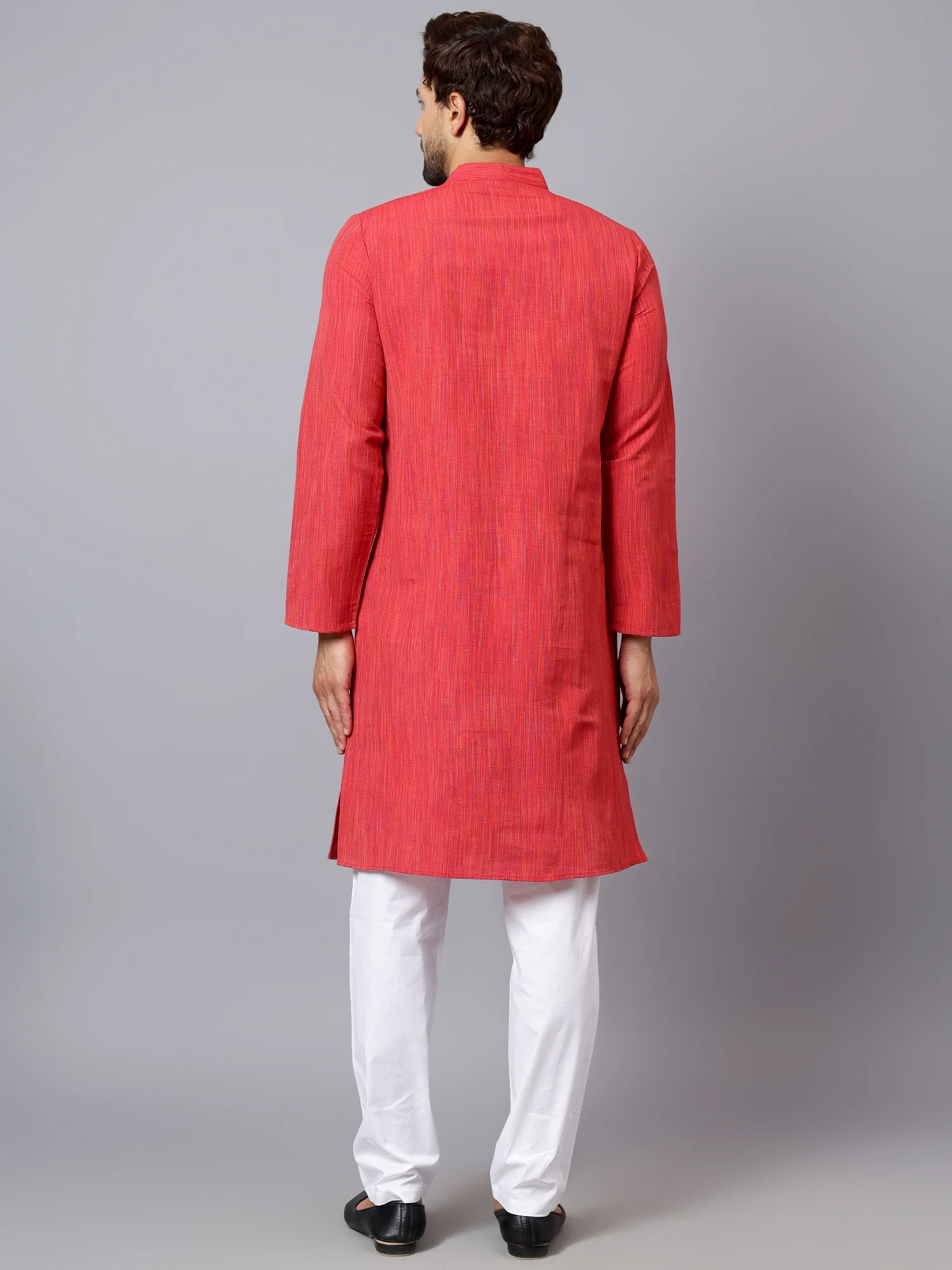 Add a touch of understated elegance to your ethnic collection with this Red textured kurta for men. Crafted from high-quality cotton-blend fabric, this kurta ensures breathability, comfort, and a relaxed fit for all-day wear. The fabric features a subtle woven texture with multitone threadwork, offering a natural and earthy appeal.