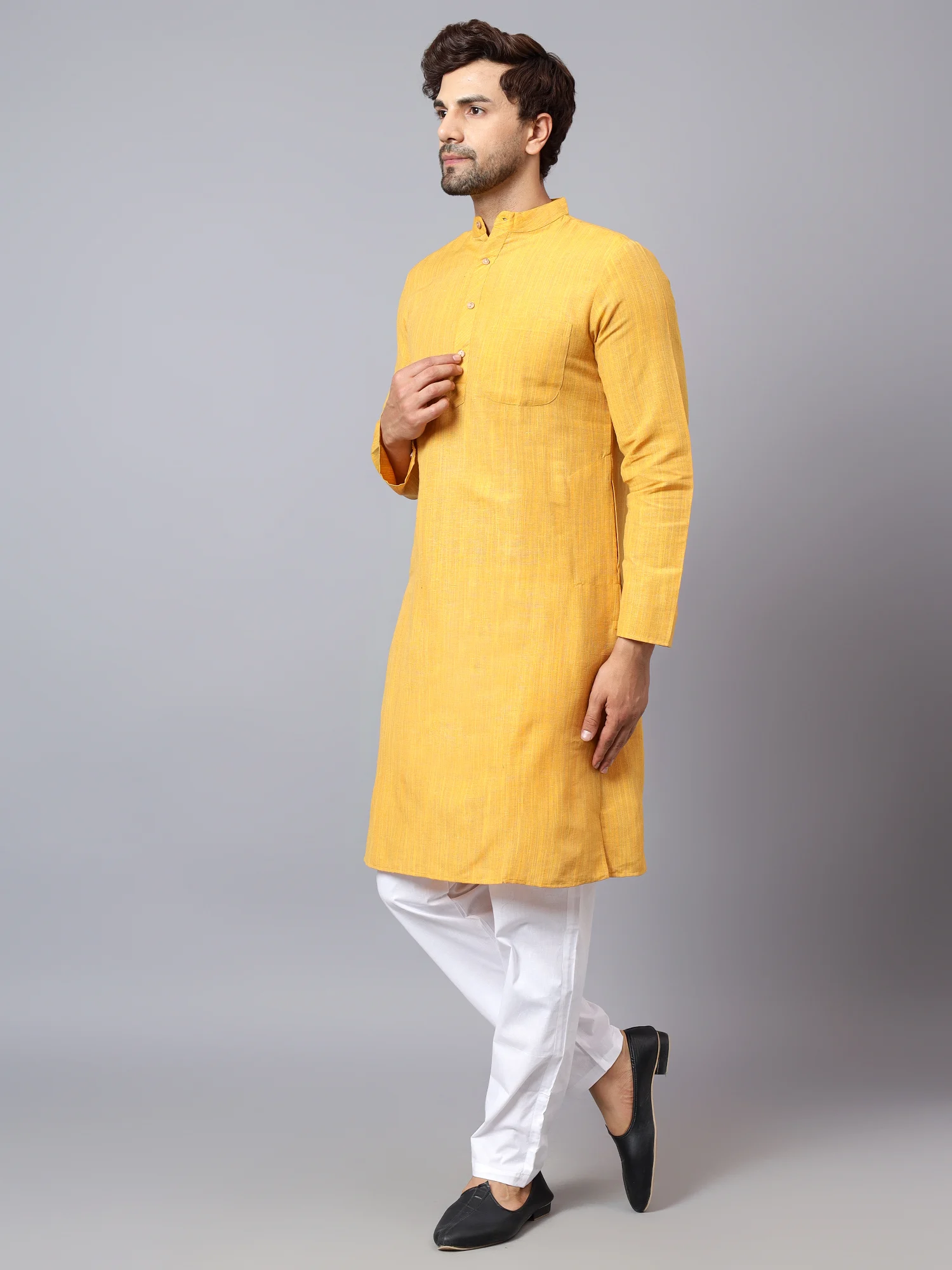 Add a touch of understated elegance to your ethnic collection with this Yellow textured kurta for men. Crafted from high-quality cotton-blend fabric, this kurta ensures breathability, comfort, and a relaxed fit for all-day wear. The fabric features a subtle woven texture with multitone threadwork, offering a natural and earthy appeal.