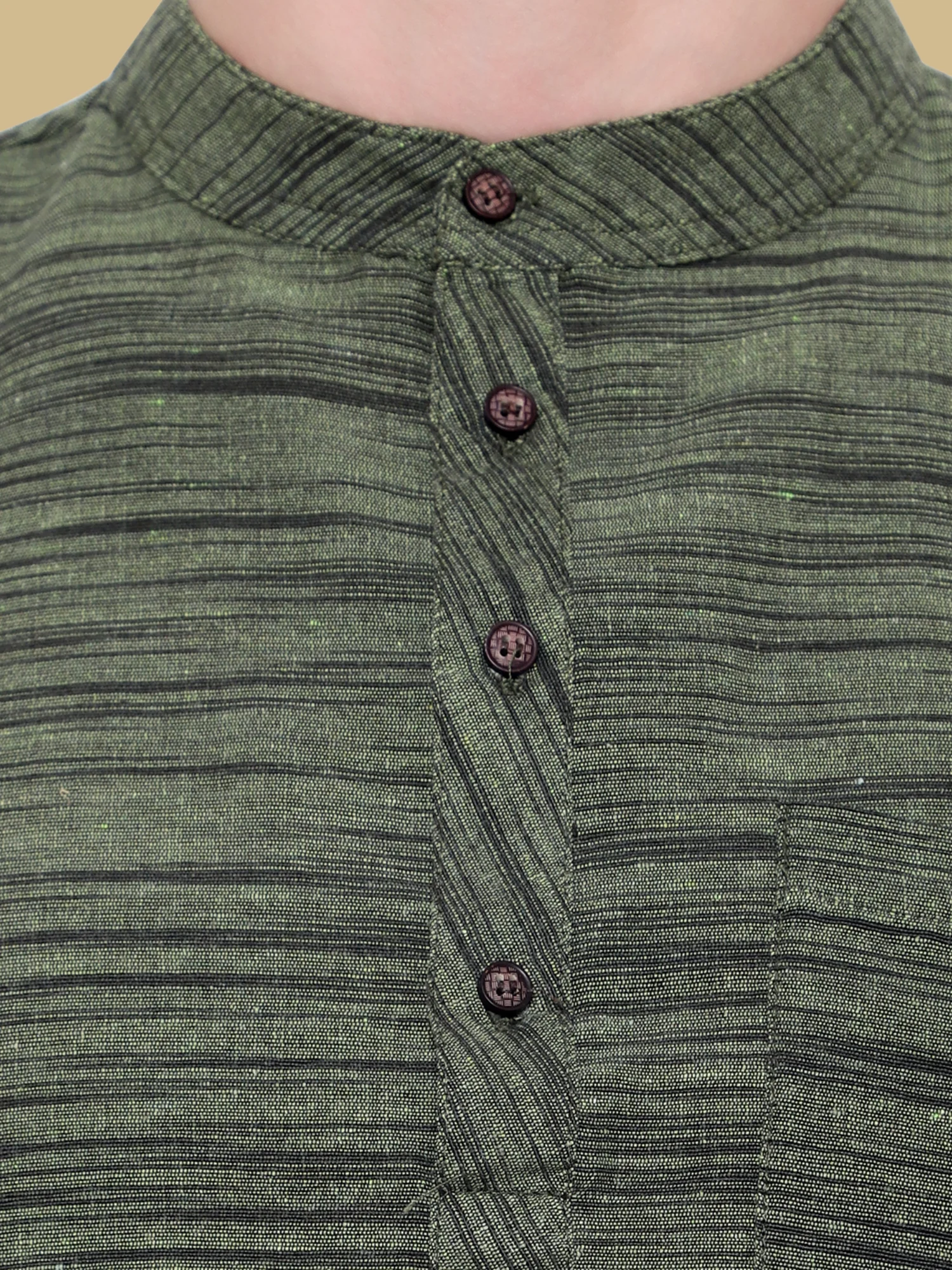 Step up your style game with this Olive Green Textured Cotton Short Kurta – a versatile blend of ethnic charm and modern simplicity. Crafted from soft, breathable cotton, this kurta ensures lasting comfort throughout the day while offering a refined look. The rich olive hue with horizontal textured detailing adds a unique visual appeal, making it an ideal choice for casual hangouts, festive occasions, or workwear with a desi twist.