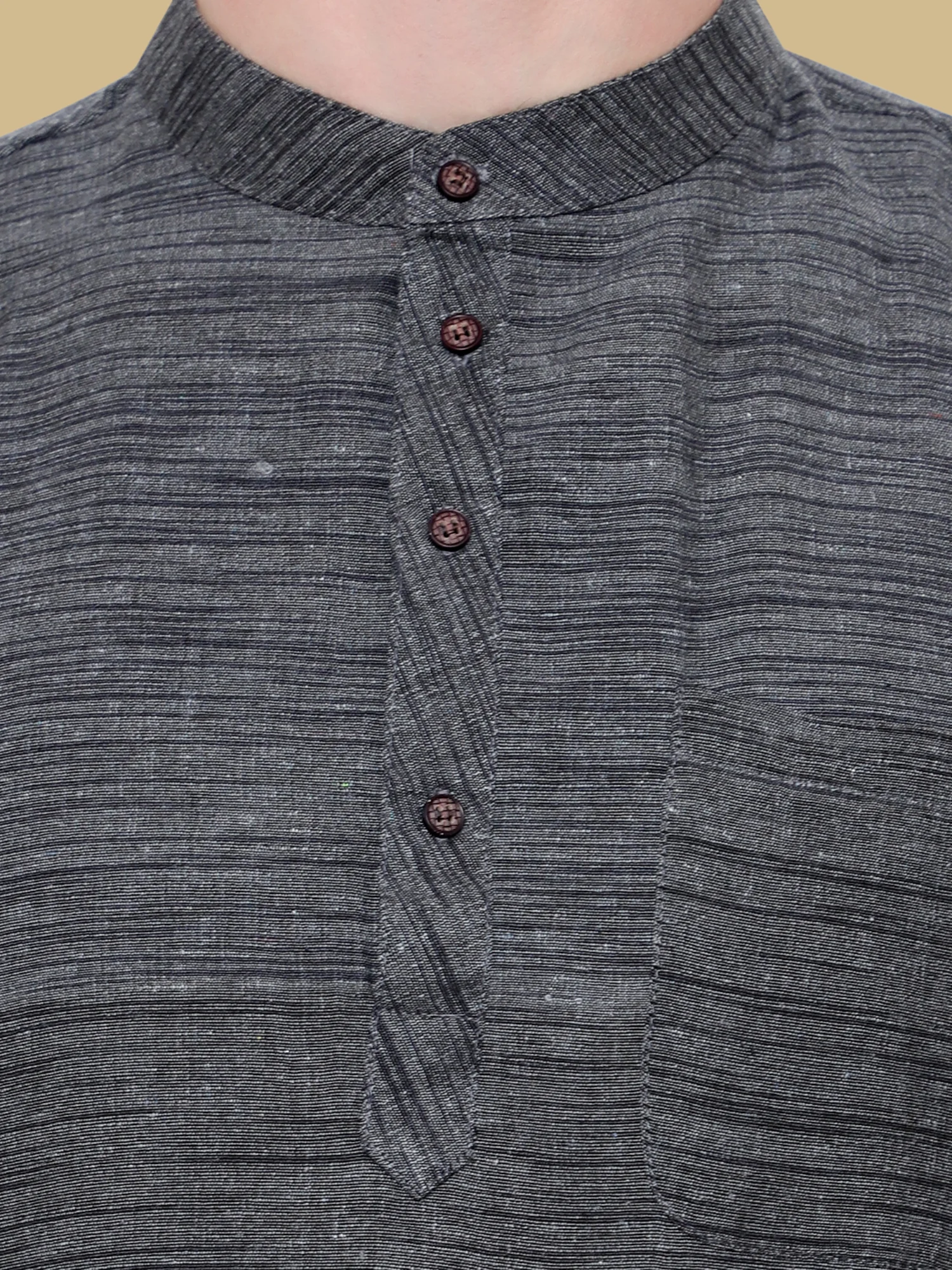 Add a touch of modern elegance to your ethnic wardrobe with this Charcoal Grey Textured Cotton Short Kurta for men. Designed for those who appreciate subtle sophistication, this kurta features a finely woven textured pattern in a deep grey shade, offering a smart yet relaxed look. Made from high-quality breathable cotton, it ensures unmatched comfort for all-day wear.