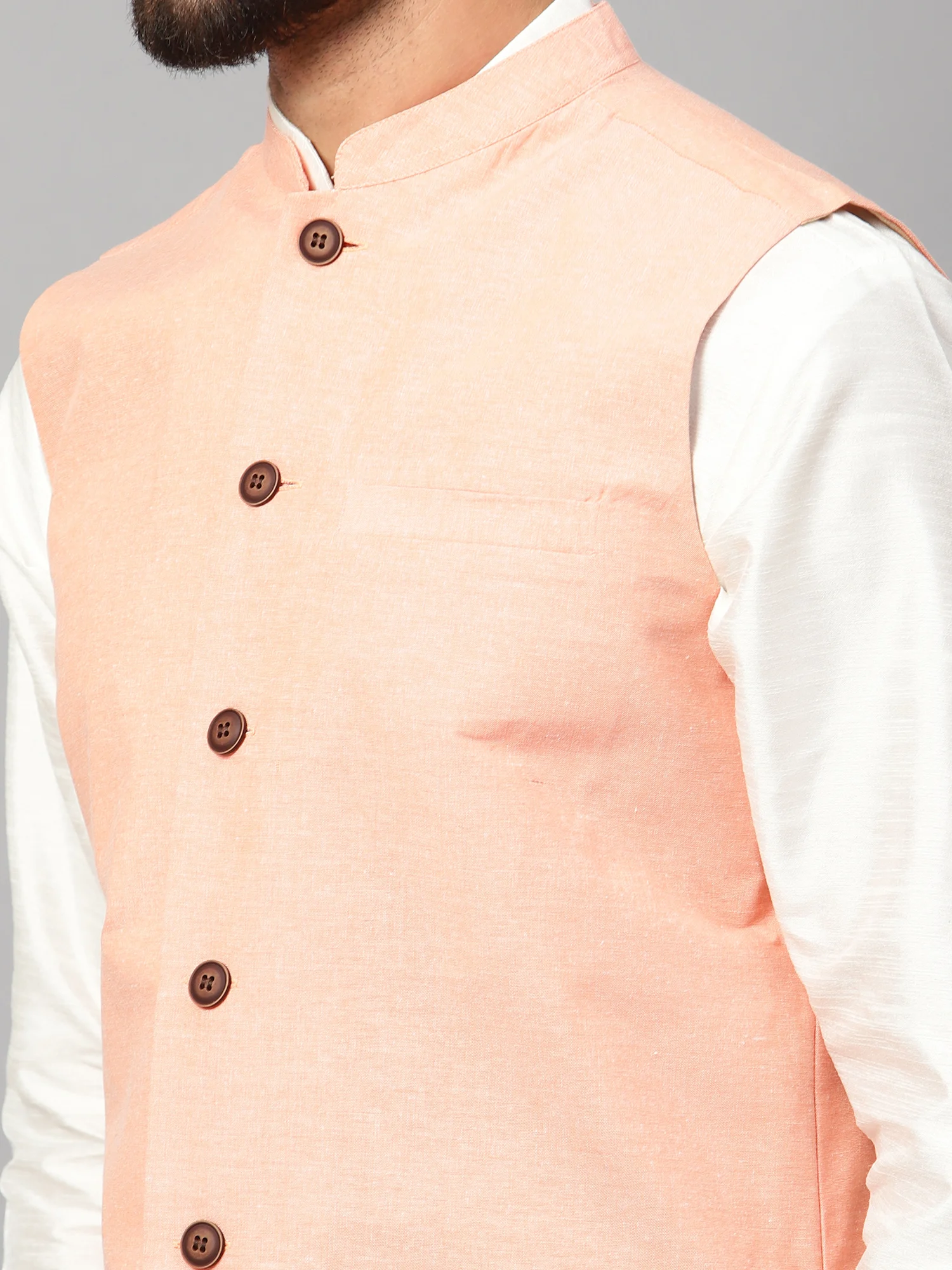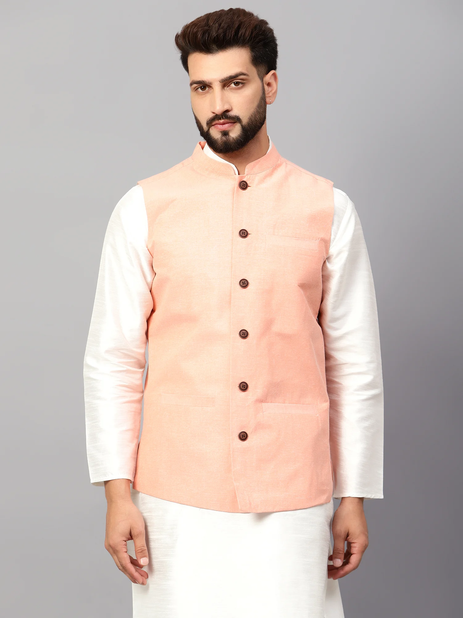 Elevate your ethnic wardrobe with this stylish Men’s Pink Solid Nehru Jacket, tailored to perfection for a modern yet traditional look. Crafted from premium-quality fabric, this sleeveless waistcoat features a smooth texture with a vibrant pink hue that adds a fresh pop of color to your ensemble. Designed with a mandarin collar, the jacket showcases a button-down front with classic wooden-style buttons, giving it an elegant finish.