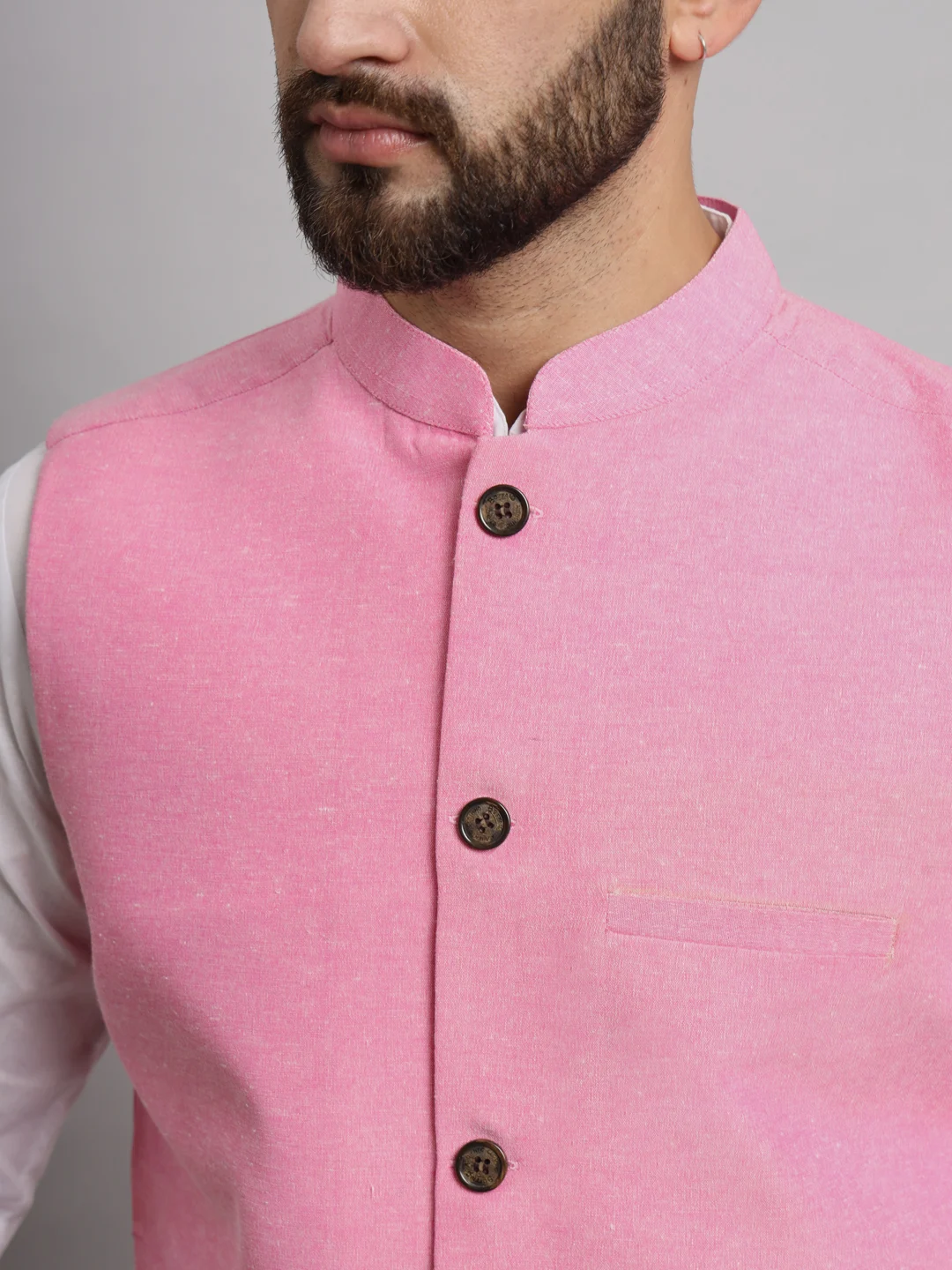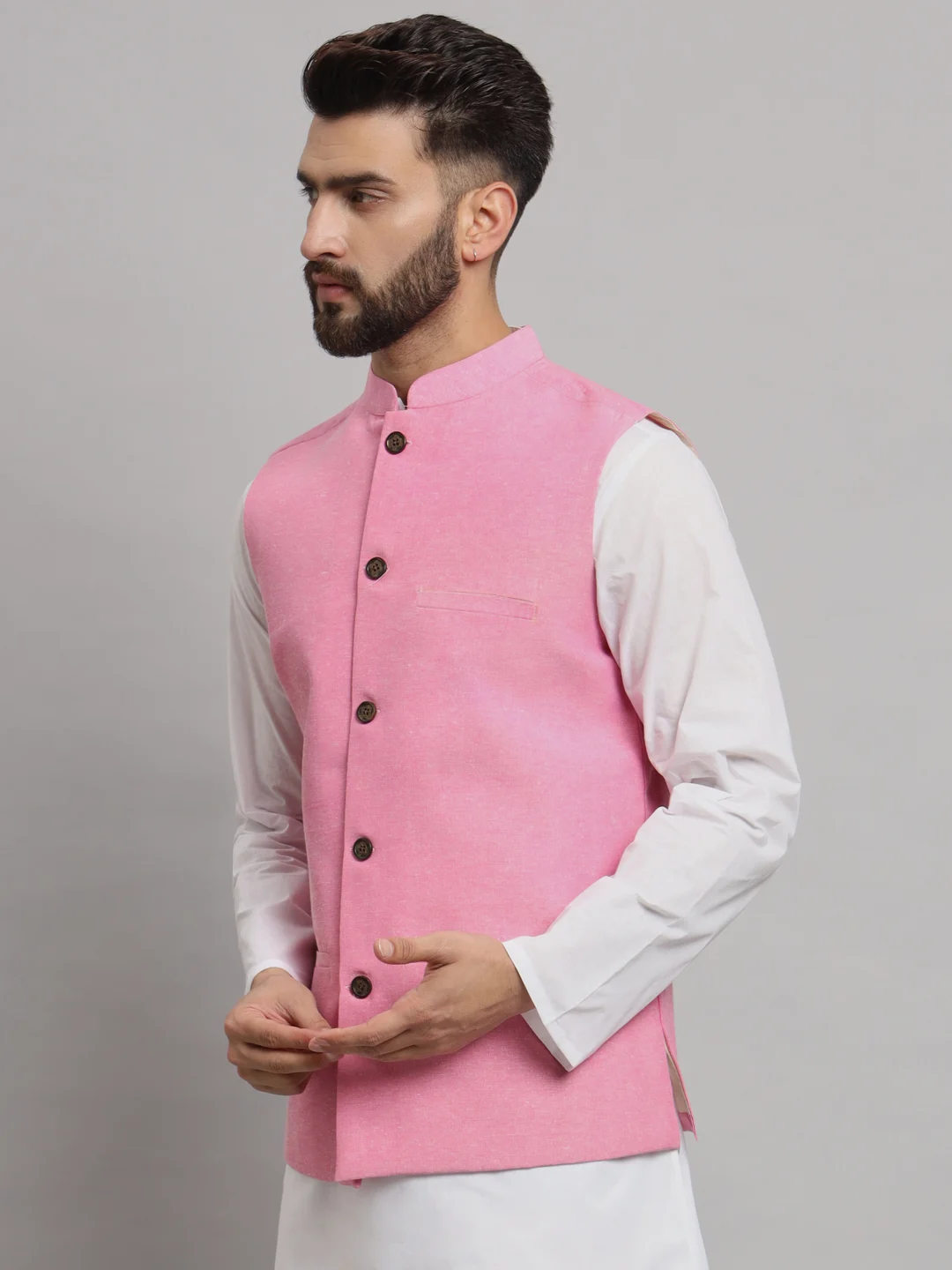 Elevate your ethnic wardrobe with this stylish Men’s Pink Solid Nehru Jacket, tailored to perfection for a modern yet traditional look. Crafted from premium-quality fabric, this sleeveless waistcoat features a smooth texture with a vibrant pink hue that adds a fresh pop of color to your ensemble. Designed with a mandarin collar, the jacket showcases a button-down front with classic wooden-style buttons, giving it an elegant finish.