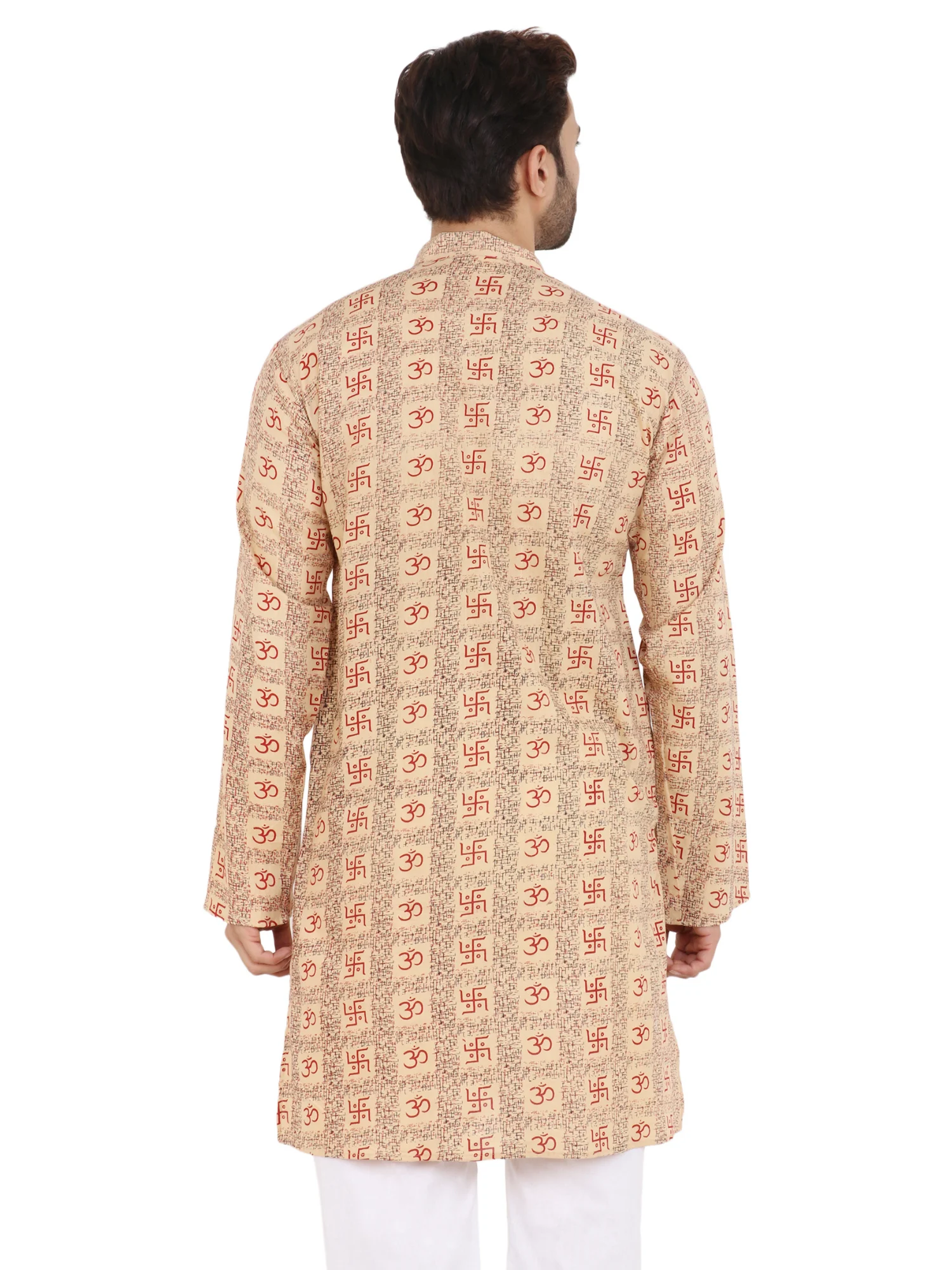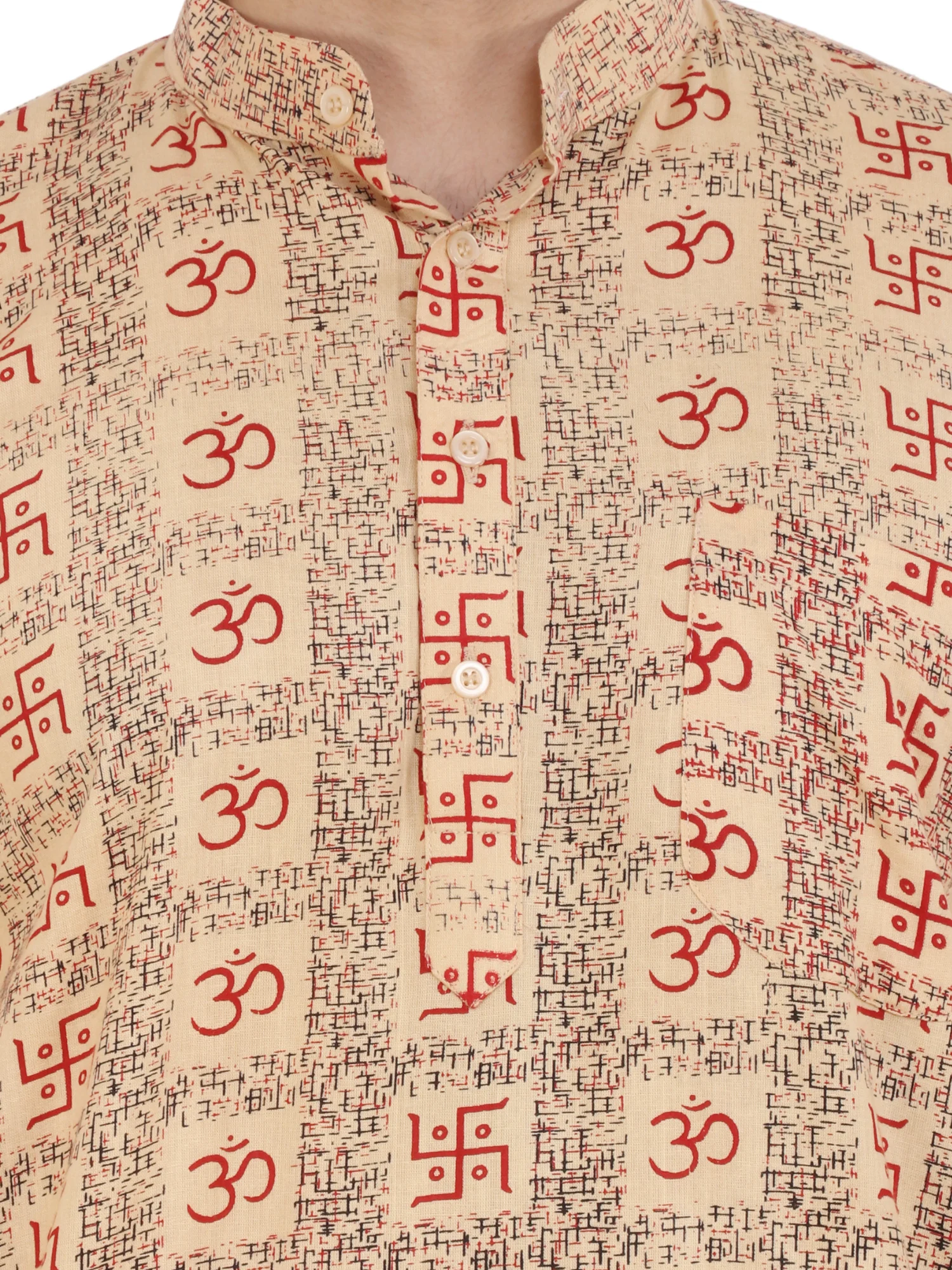 This image shows a traditional Indian man’s kurta made from a light beige cotton fabric featuring an all-over spiritual print. The design includes repeated red “Om (ॐ)” symbols and Swastik motifs, arranged in vertical patterned panels. The kurta has a mandarin collar, a short button placket with wooden-style buttons, and a comfortable, casual fit suitable for festive, cultural, or meditation wear.
