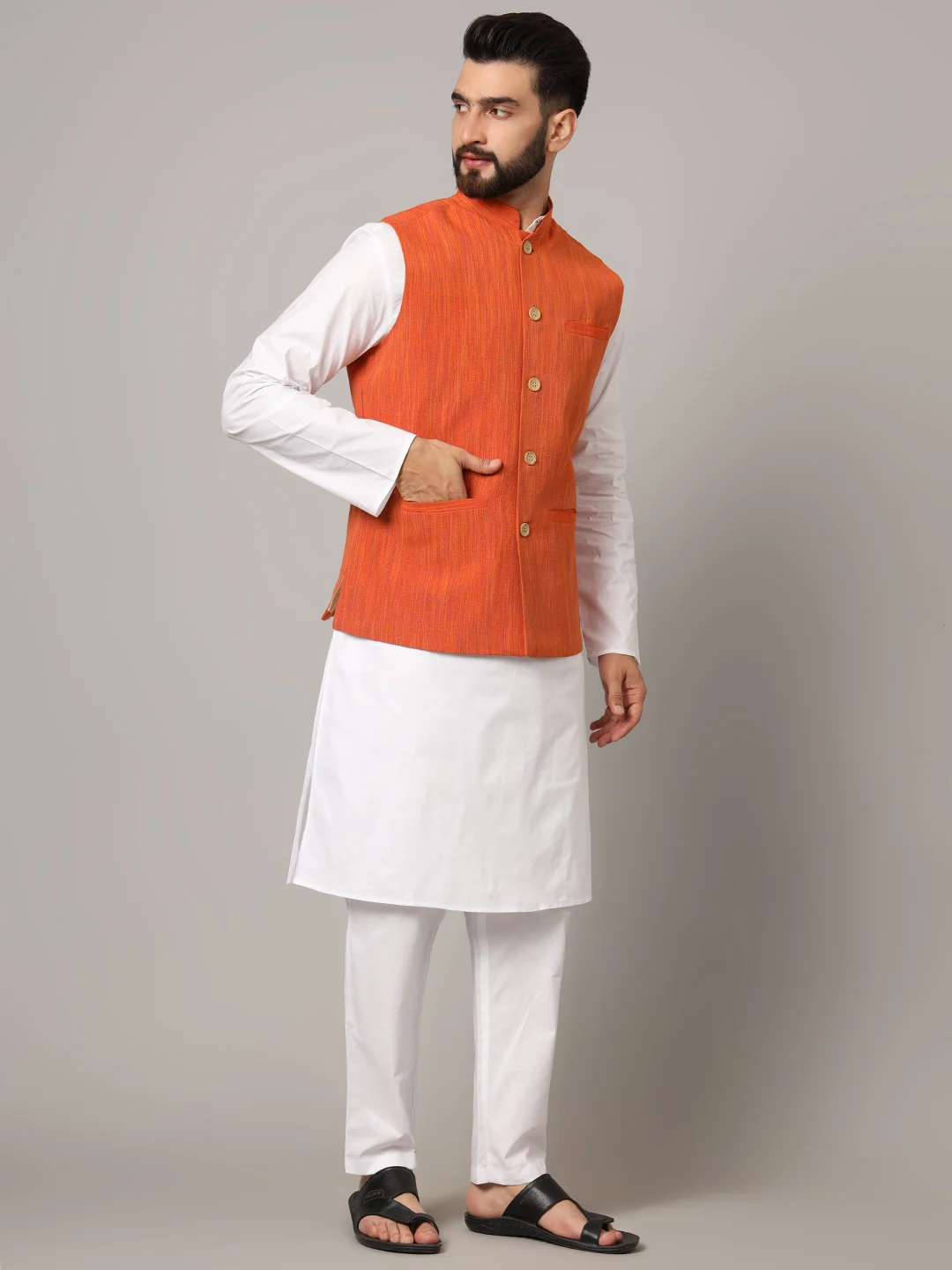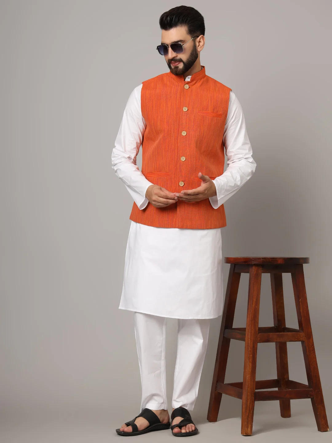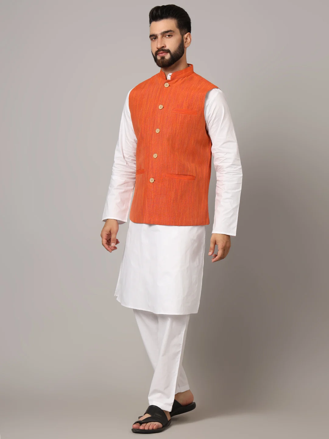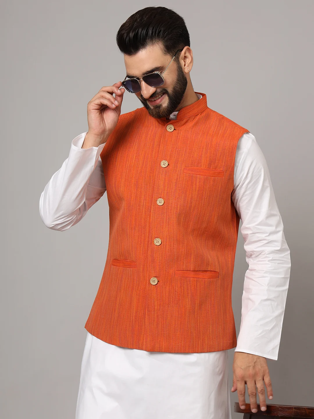 Brighten up your ethnic ensemble with the Hazim Men’s Rust Orange Nehru Jacket. Crafted with precision from fine-textured fabric, this sleeveless jacket features a stand-up Mandarin collar, classic wooden buttons, and handy pockets. Ideal for weddings, festive events, or traditional gatherings, this vibrant piece pairs effortlessly with kurtas or shirts for a regal, stylish appearance.