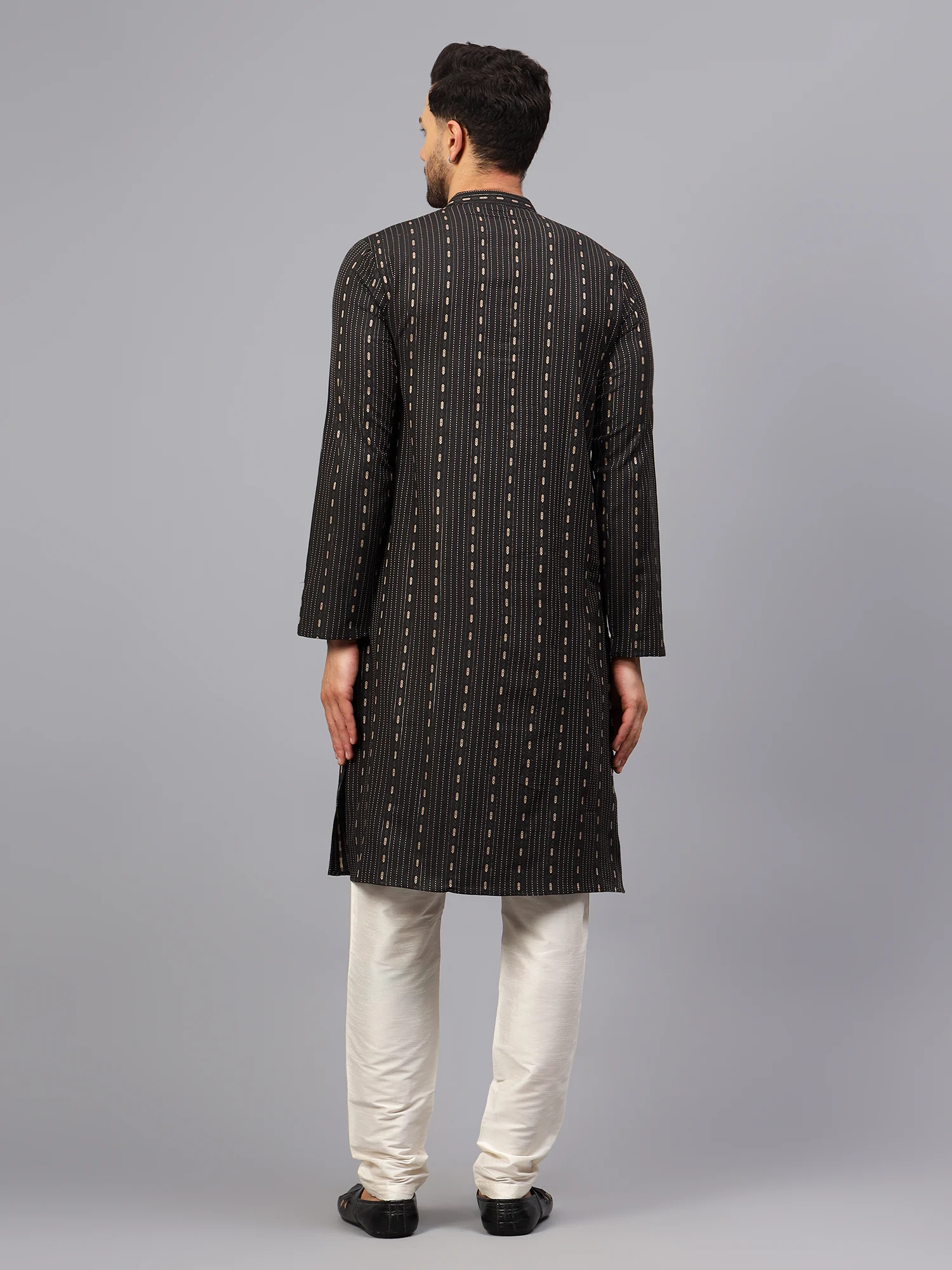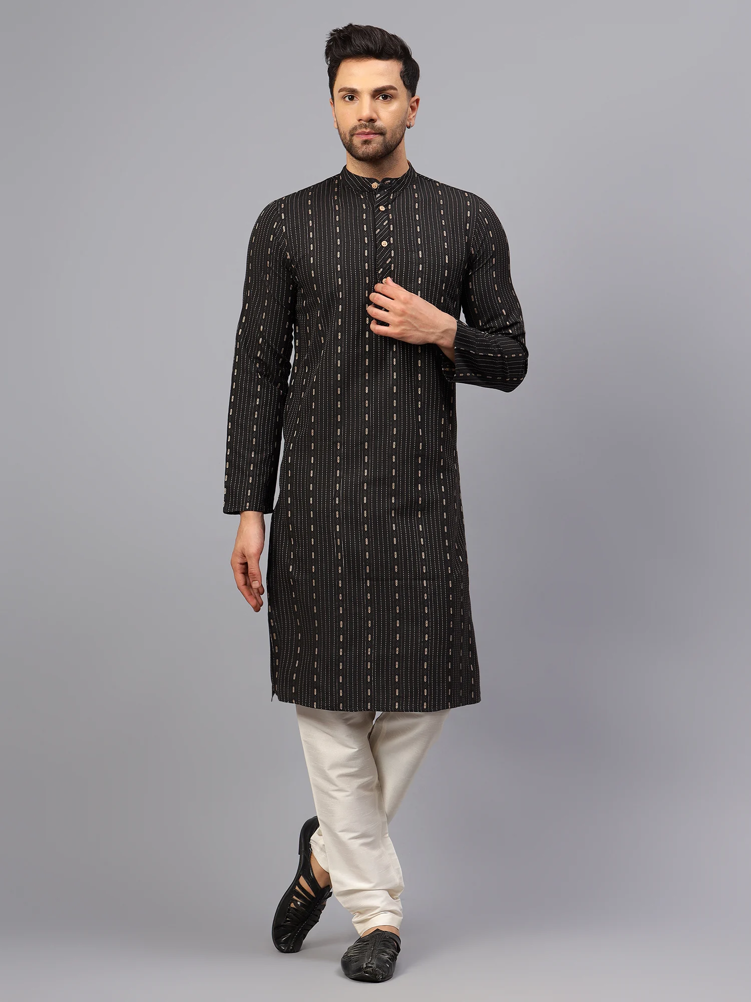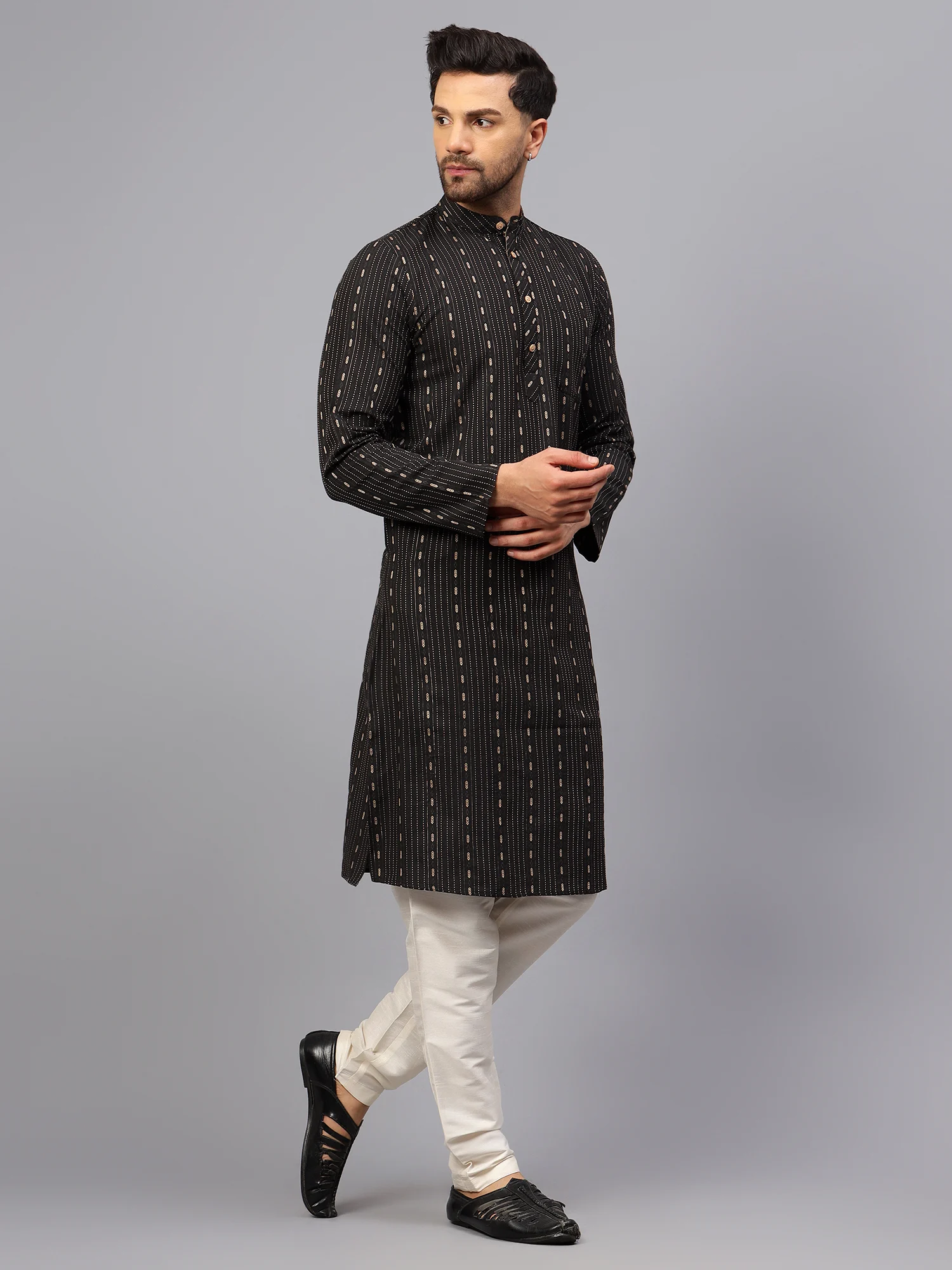 Upgrade your ethnic wear collection with this elegant black printed kurta for men. Crafted from soft and breathable cotton fabric, it features a subtle yet stylish geometric print in vertical alignment. The kurta comes with a mandarin collar, a short button placket with wooden buttons, and a chest pocket for added utility. Ideal for festive occasions, family gatherings, or cultural events, this kurta delivers both comfort and charm effortlessly.