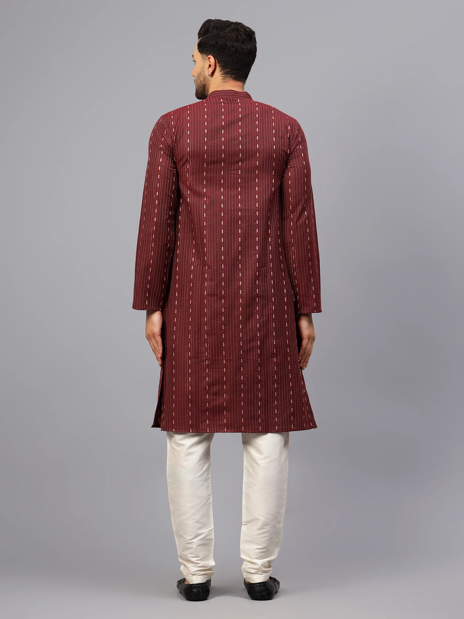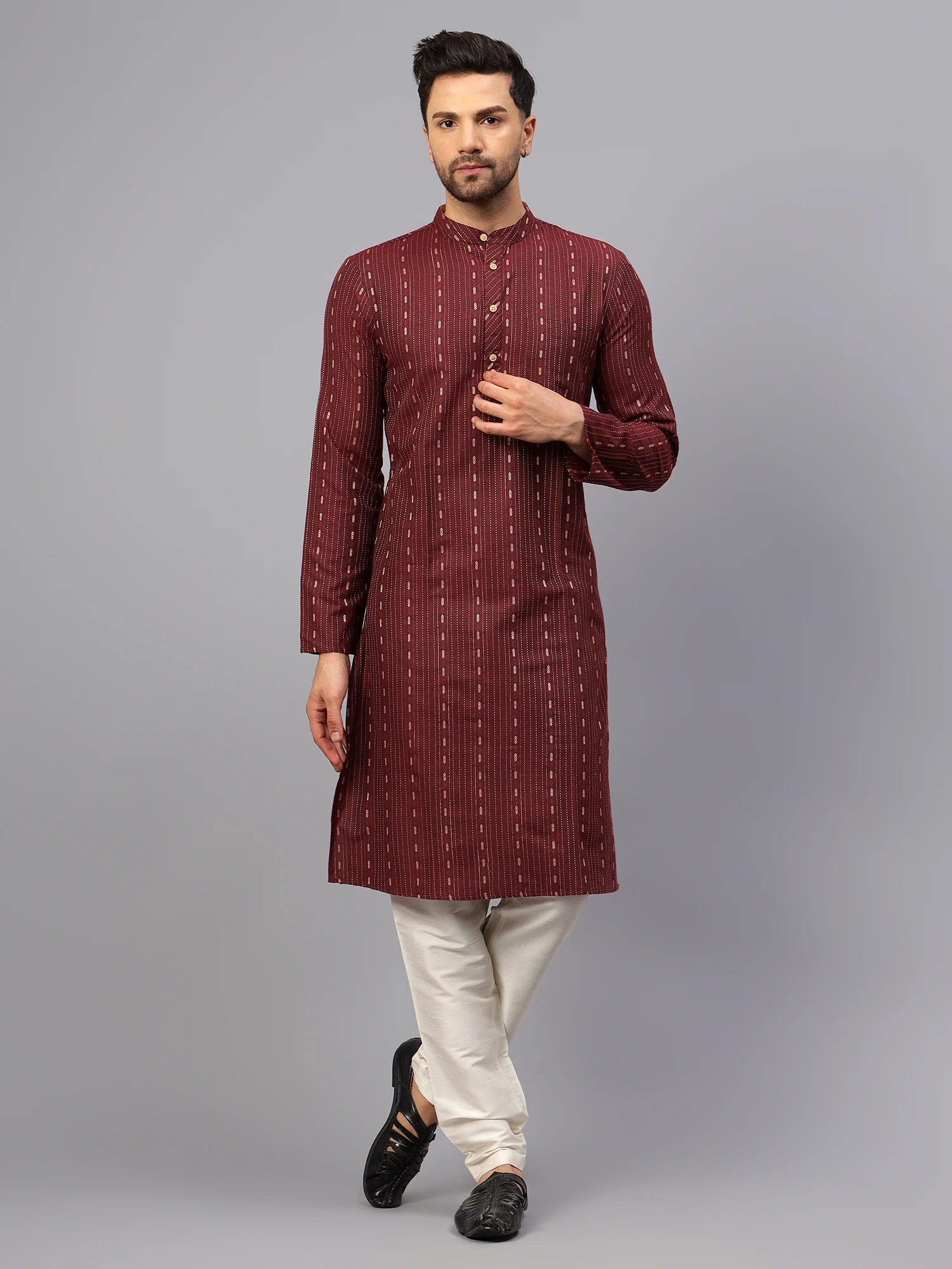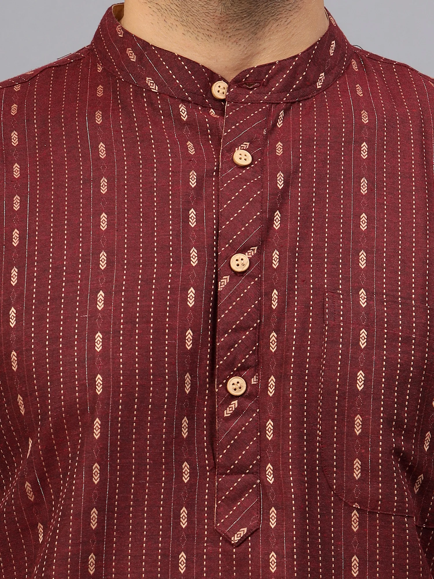 Upgrade your ethnic wear collection with this elegant maroon printed kurta for men. Crafted from soft and breathable cotton fabric, it features a subtle yet stylish geometric print in vertical alignment. The kurta comes with a mandarin collar, a short button placket with wooden buttons, and a chest pocket for added utility. Ideal for festive occasions, family gatherings, or cultural events, this kurta delivers both comfort and charm effortlessly.