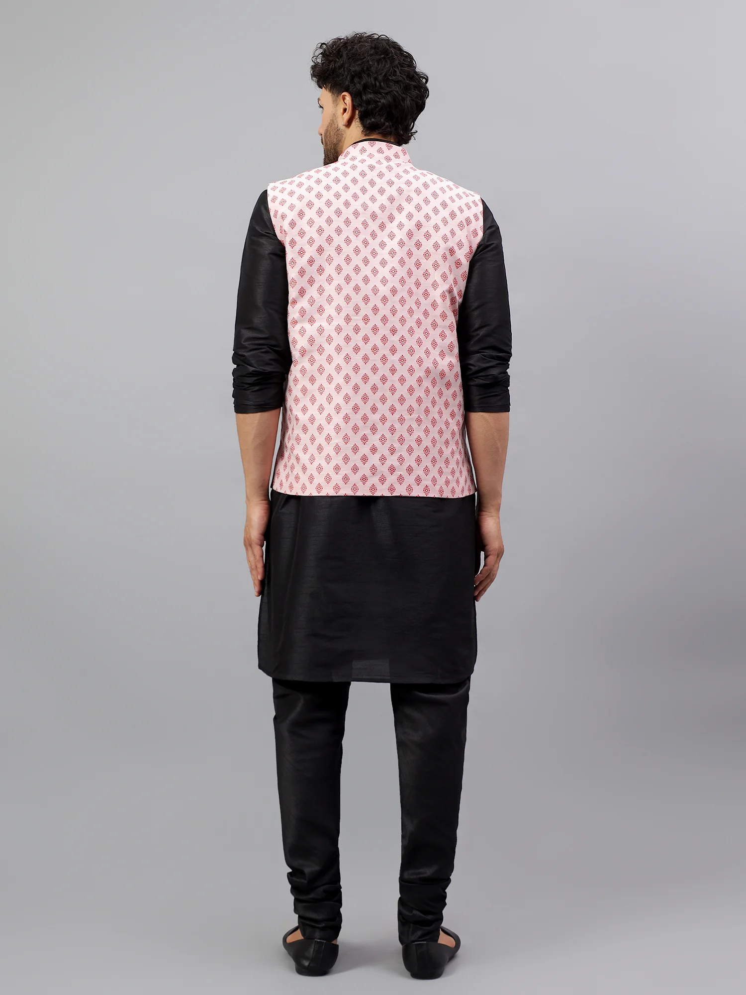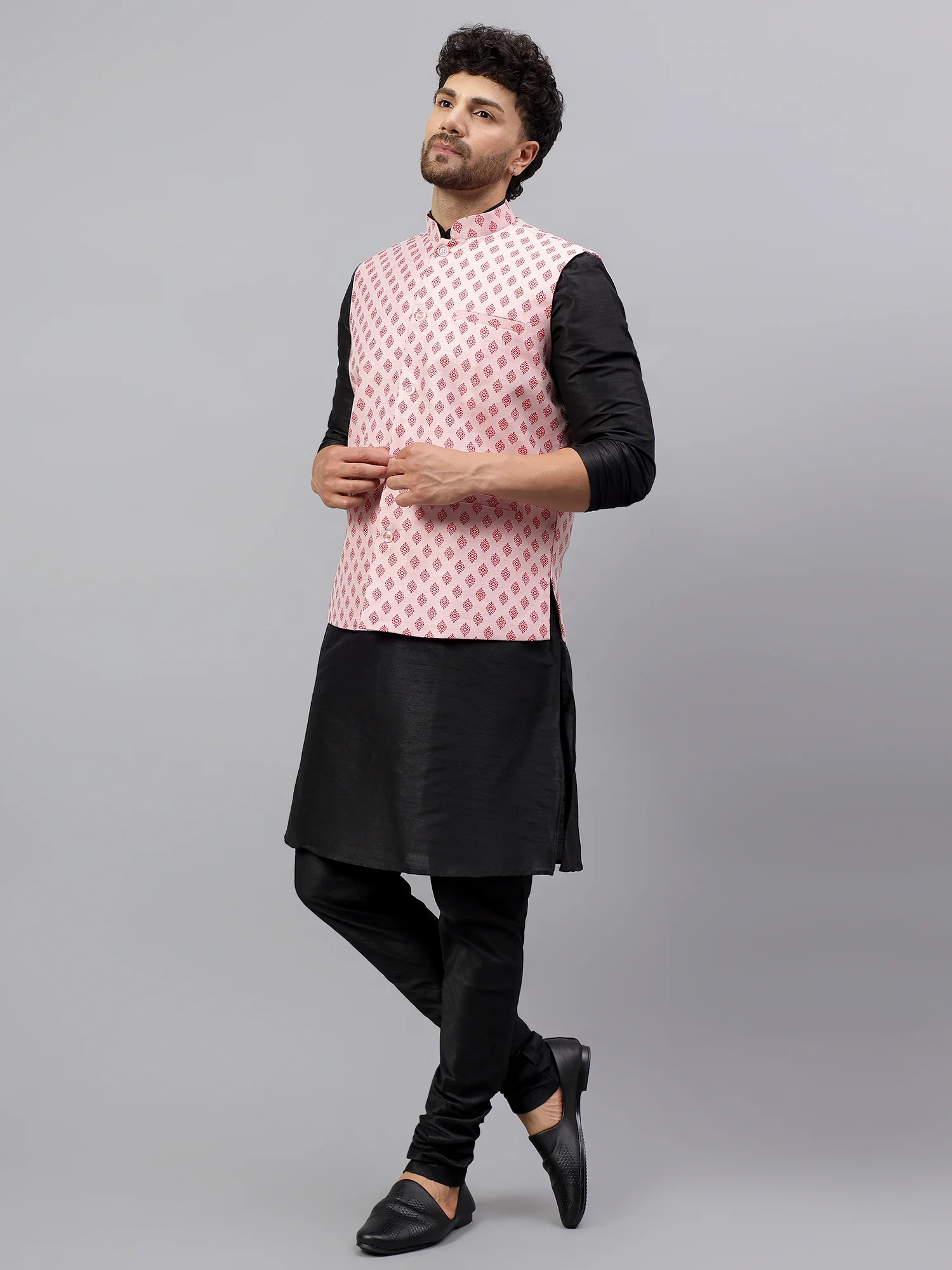 Make a bold yet elegant ethnic statement with this Men’s Pink & Red Brocade Nehru Jacket, thoughtfully designed for festive and special occasions. Crafted from a premium silk-blend fabric, this sleeveless waistcoat features a striking contrast of vibrant red woven motifs on a soft pink base, offering a perfect blend of traditional charm and contemporary flair.