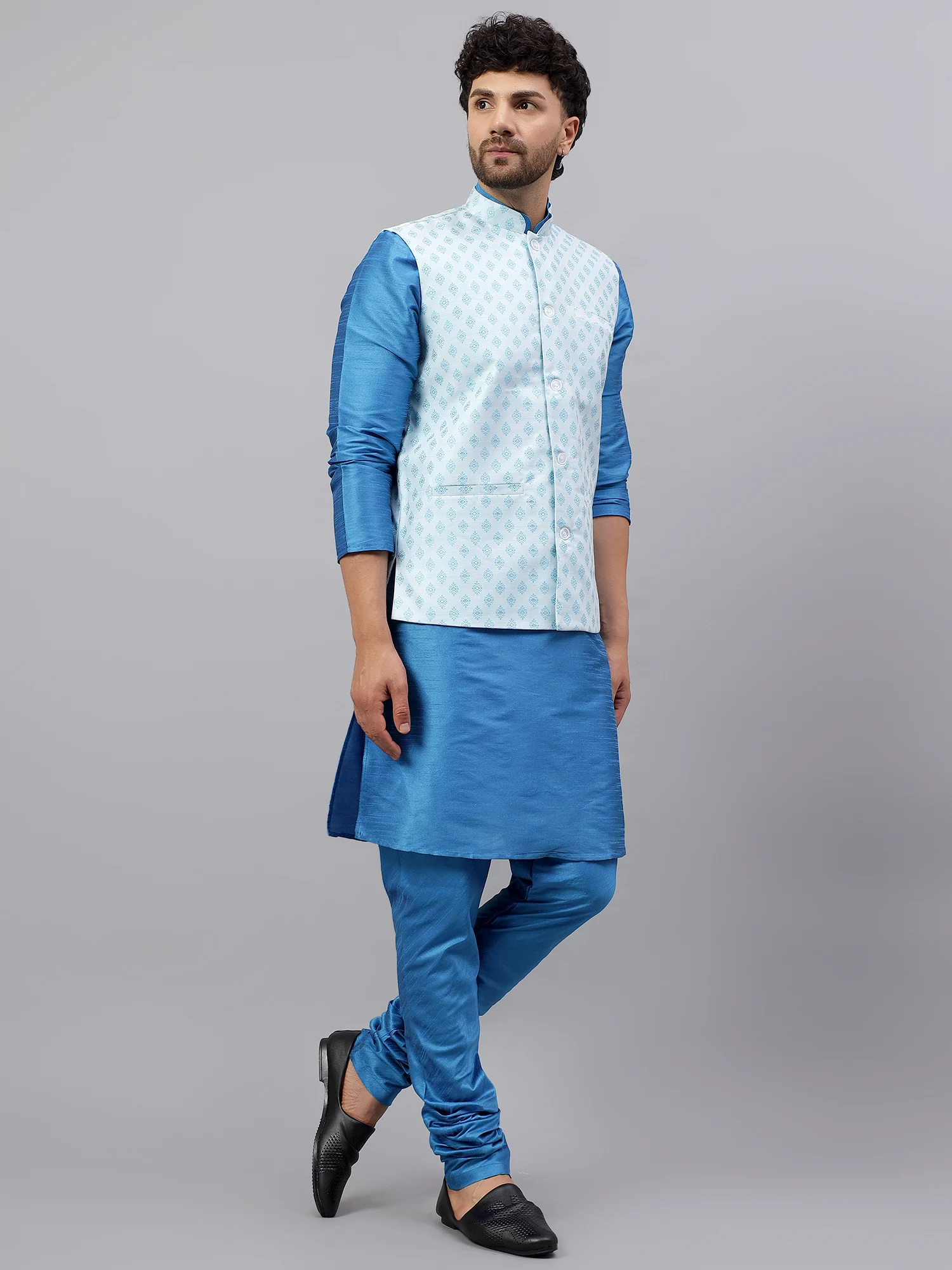 The high Mandarin collar, sleek front button placket with matching white buttons, and functional welt pockets bring structure and elegance to the design. Whether you’re dressing up for a wedding, a festive celebration, or a formal ethnic gathering, this jacket layers effortlessly over kurtas, shirts, or pathani suits.