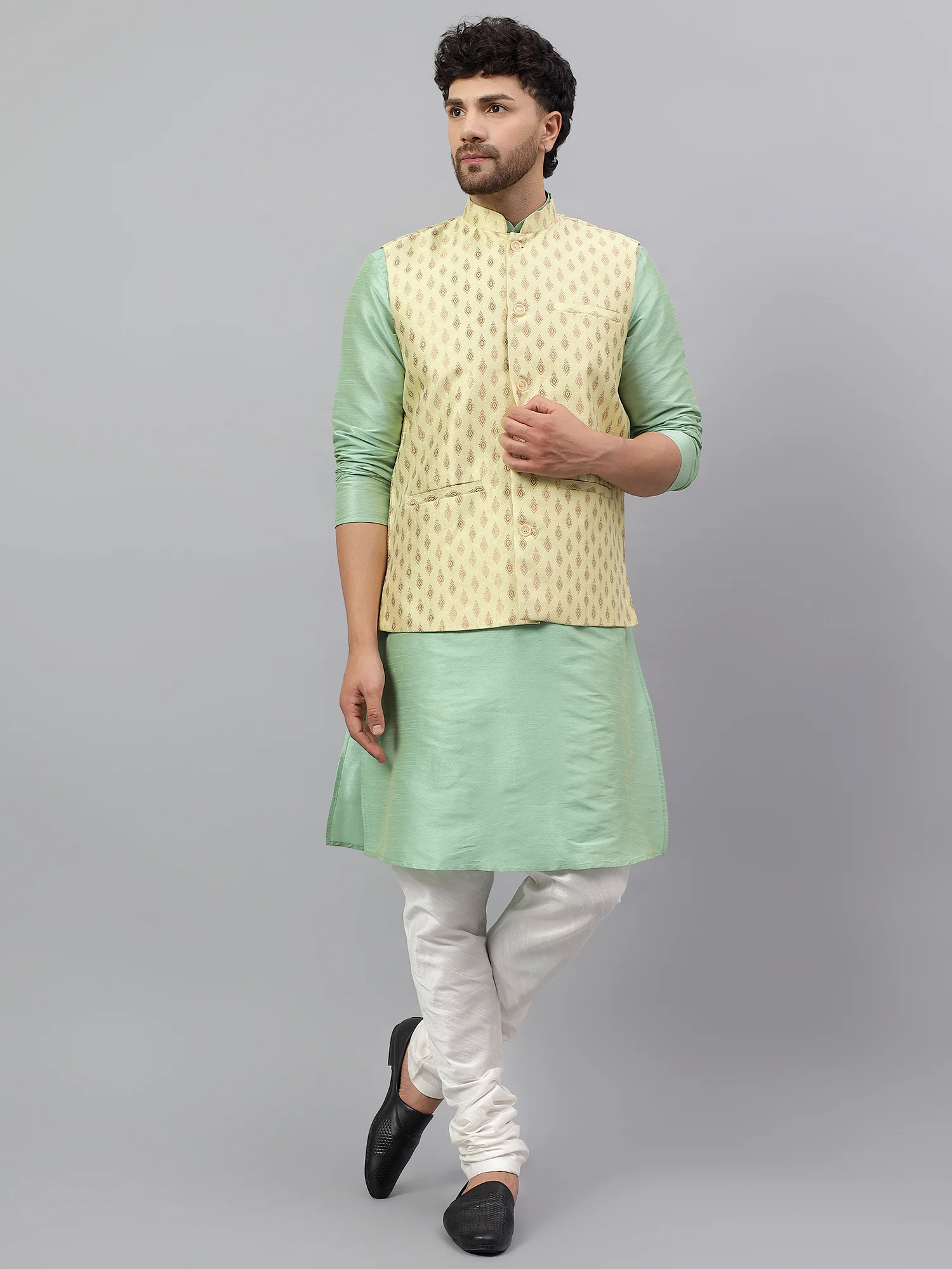 Add a splash of sophistication and ethnic charm to your wardrobe with this Men’s Light Yellow Silk Blend Jacquard Nehru Jacket. This elegant sleeveless jacket is tailored from a luxurious silk blend fabric, featuring a subtle sheen and intricate jacquard work in a traditional diamond motif. The warm light yellow base with golden woven accents exudes festive grace, while the structured mandarin collar enhances the overall traditional appeal. It comes with a front button closure, a chest welt pocket, and two lower welt pockets that offer both function and style. Perfect to layer over a kurta-pajama or a formal shirt, this jacket is a versatile pick for weddings, receptions, Diwali parties, or any celebratory occasion.