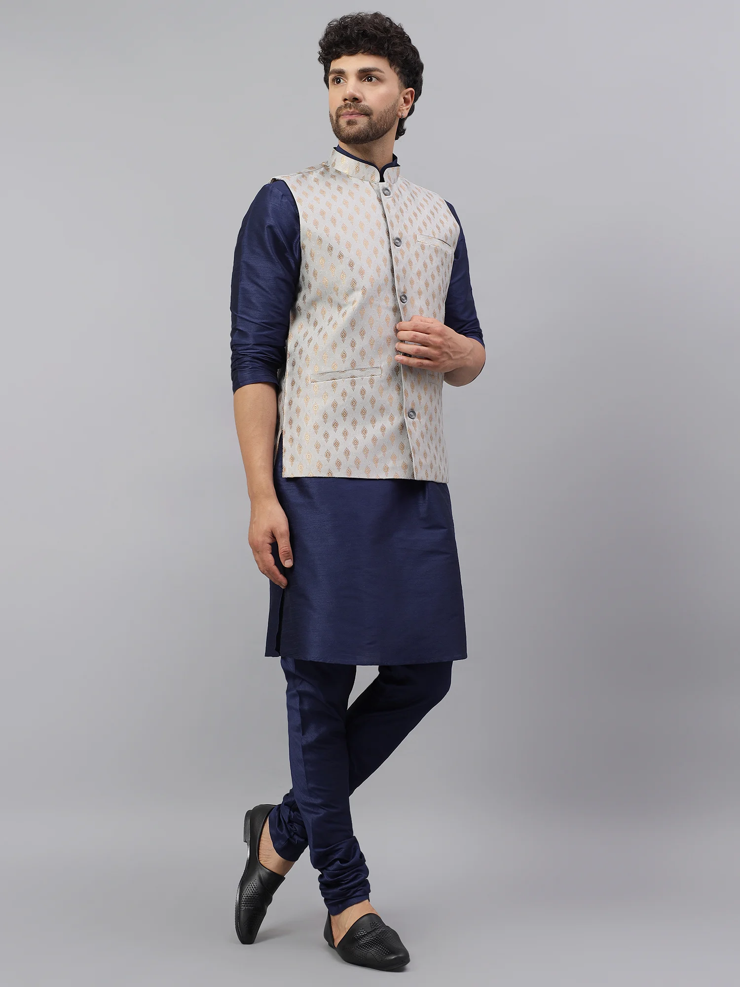 Make a statement of understated elegance with this Men’s White & Gold Silk Blend Jacquard Nehru Jacket, a perfect blend of tradition and sophistication. Tailored from a premium silk blend fabric, this sleeveless ethnic jacket features a subtle off-white base adorned with intricate golden jacquard motifs, offering a luxurious yet classic appearance. The contrasting navy blue mandarin collar adds a sharp and modern touch, perfectly complementing festive or formal outfits. Designed with a front button closure and three welt pockets (one on the chest and two at the waist), it combines functionality with fashion. Ideal for weddings, receptions, festive occasions, or traditional family events, this versatile piece can be paired effortlessly with a kurta or a shirt for a regal ethnic look.