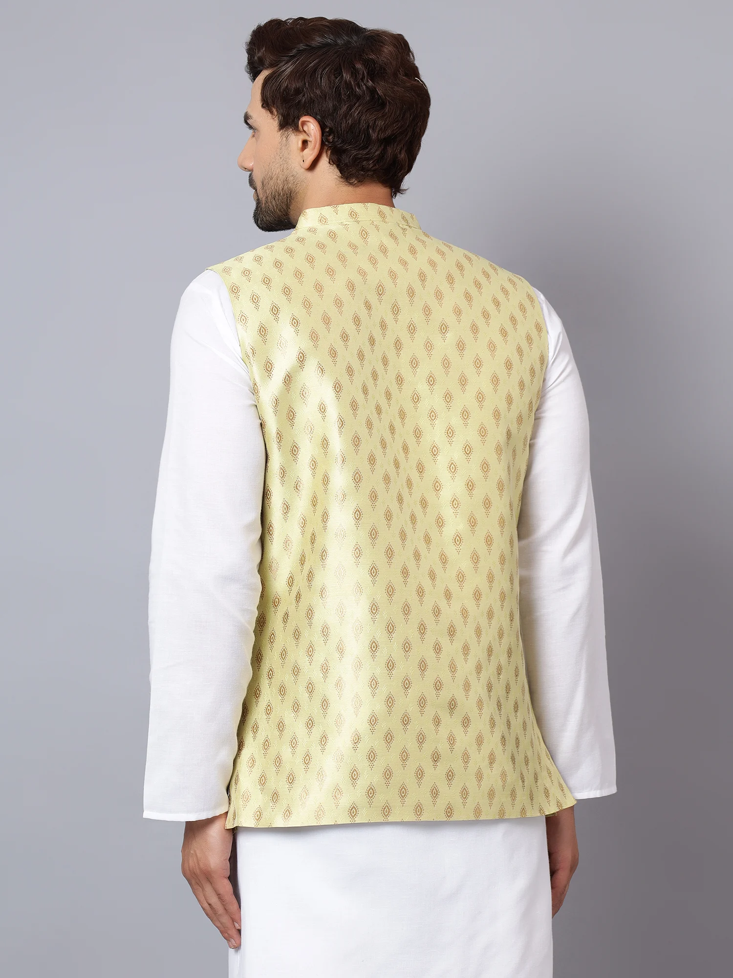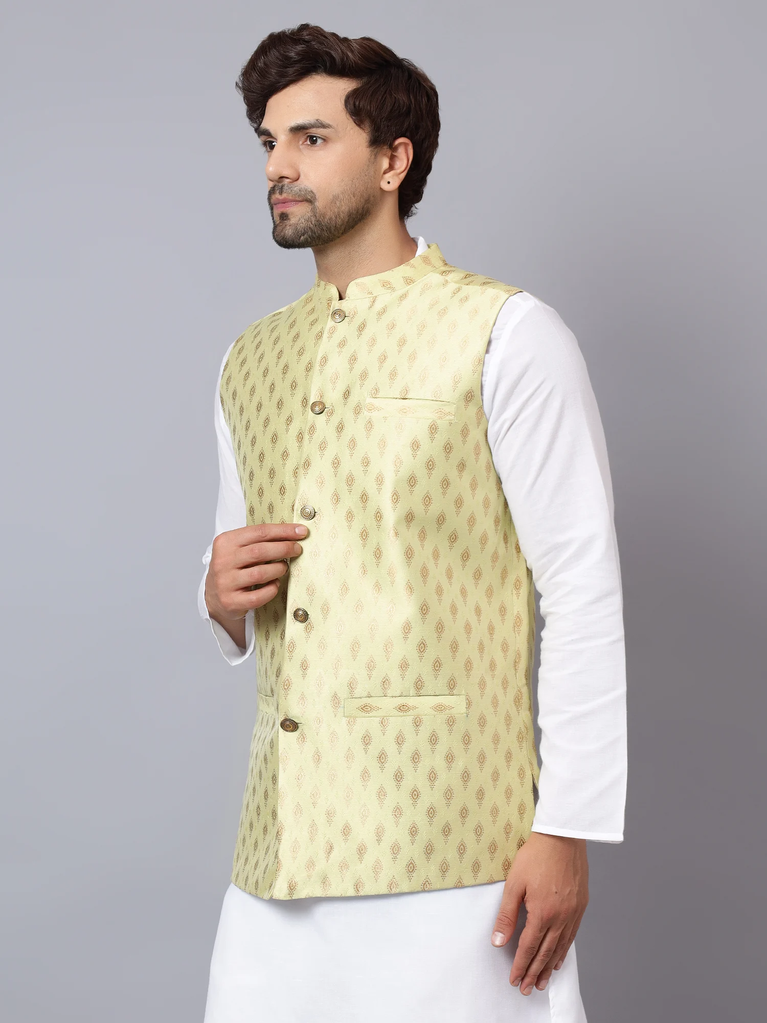 Make a refined and regal impression with this Men’s Light Cream Brocade Nehru Jacket, designed to bring elegance and tradition together seamlessly. Crafted from rich, lightweight brocade fabric, this sleeveless jacket features an all-over golden zari diamond motif that adds depth and opulence to the soft pastel yellow base. The high mandarin collar and metallic antique-style buttons lend a classic royal touch, making this piece perfect for festive events, haldi ceremonies, poojas, and wedding celebrations. With a slim tailored fit, the jacket includes three welt pockets—two at the waist and one on the chest—combining functionality with ethnic charm. Whether layered over a white kurta-pajama or styled with Indo-western fusion wear, this jacket is a wardrobe essential for the modern man with a love for heritage.