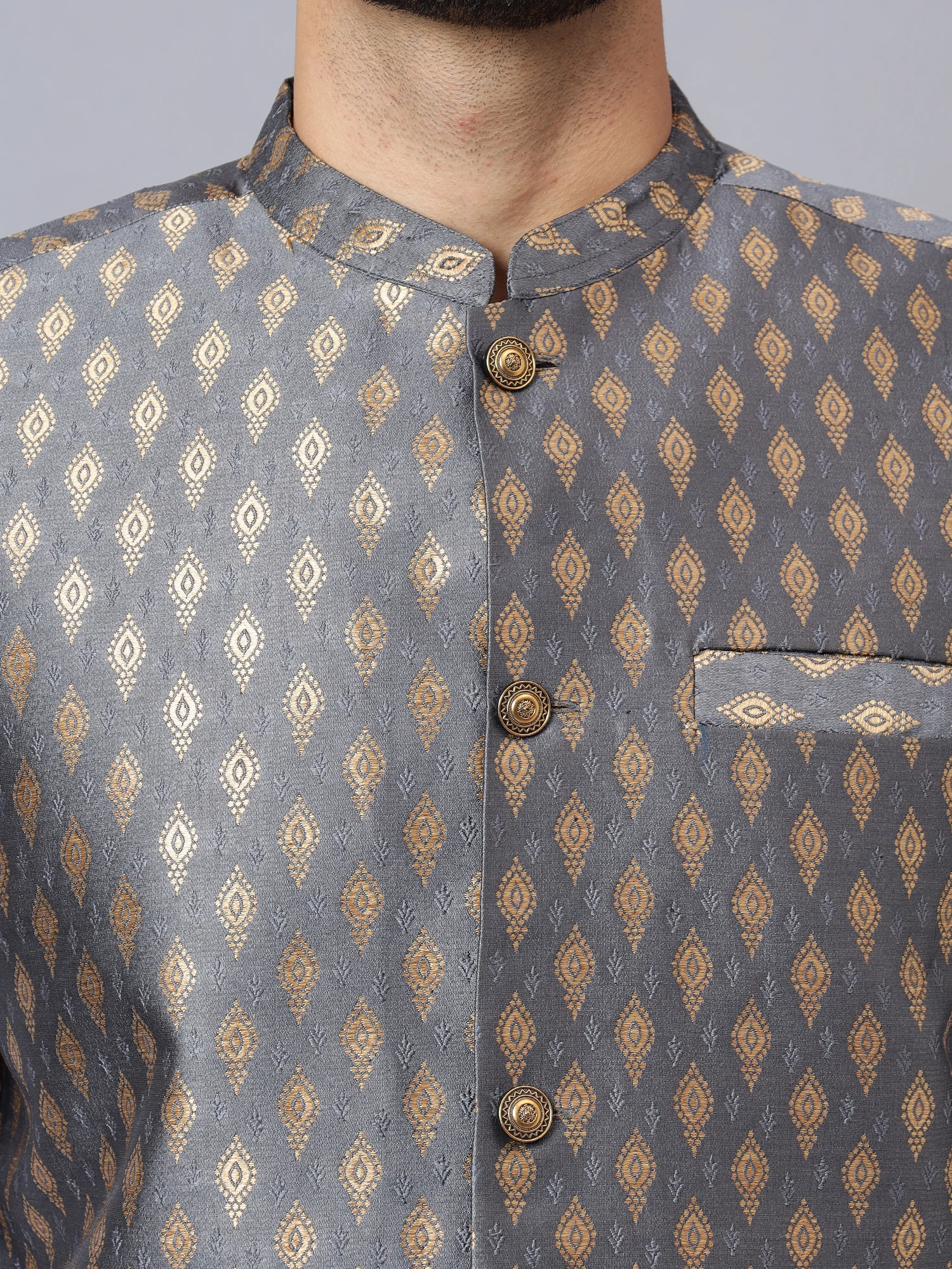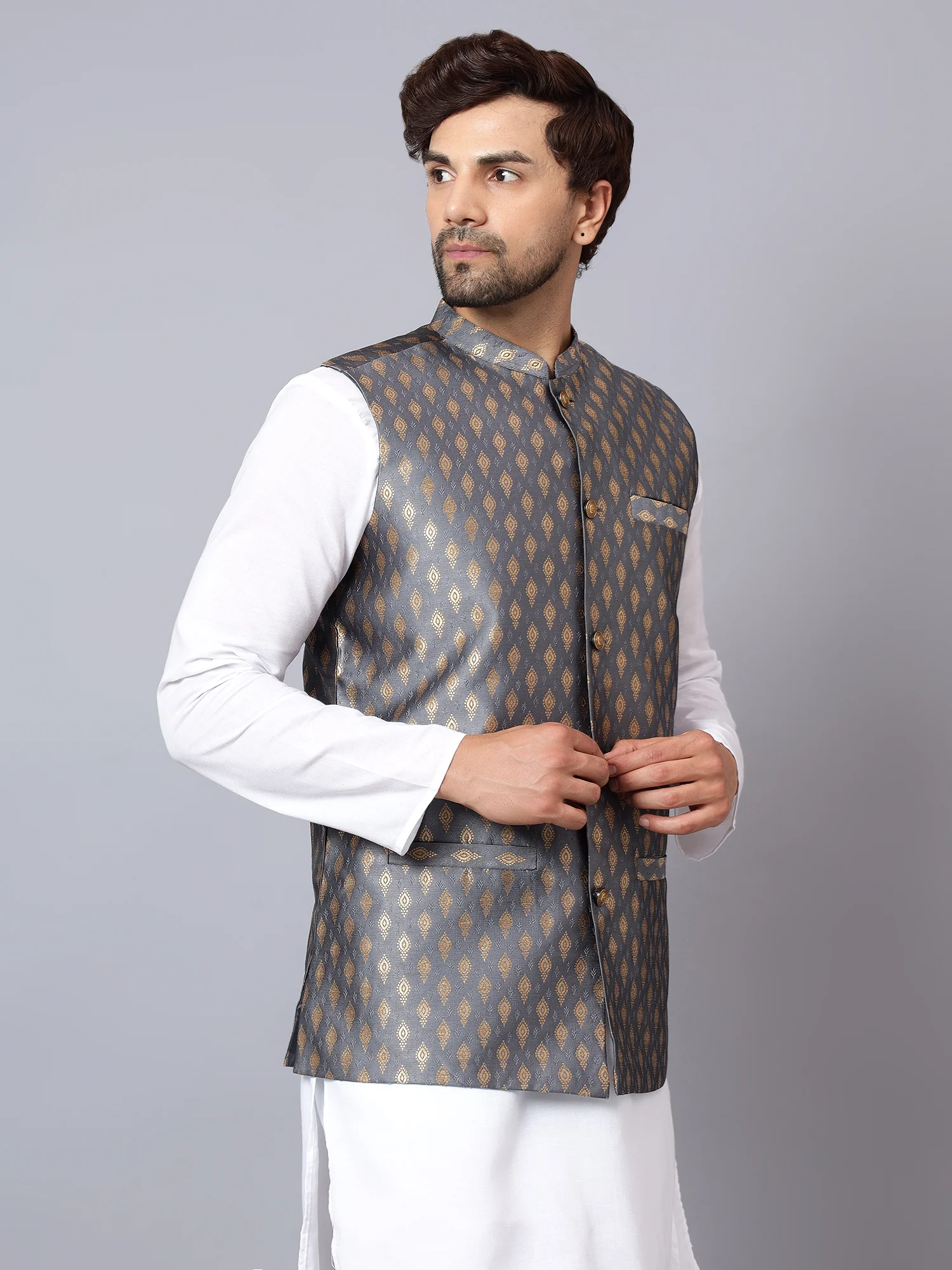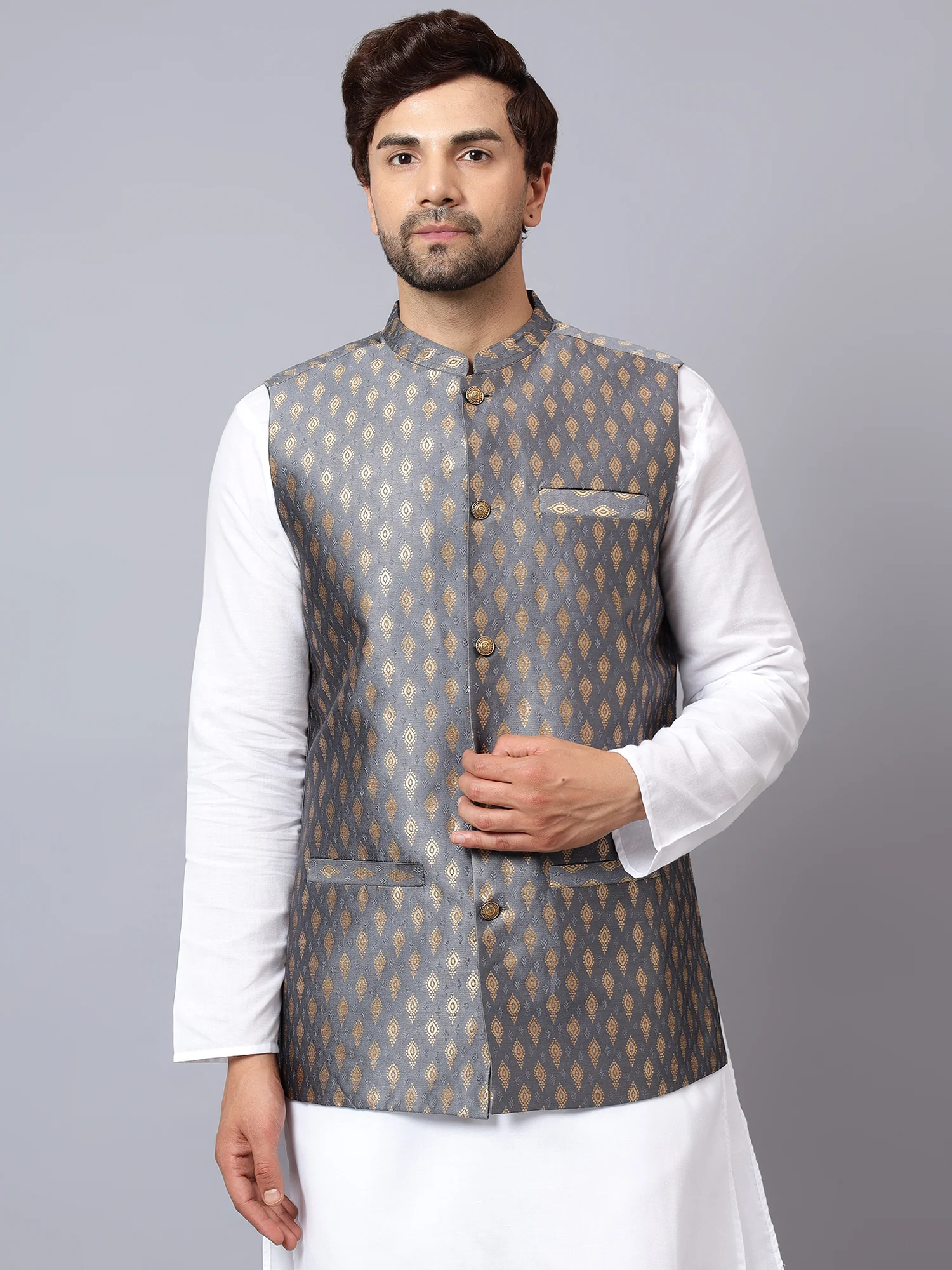Make an effortlessly regal statement at your next festive celebration or wedding event with this Men’s Charcoal Grey Brocade Nehru Jacket, a sophisticated blend of classic design and modern elegance. This sleeveless ethnic jacket is crafted from premium-quality brocade fabric, featuring a deep grey base adorned with all-over golden zari diamond motifs that shimmer subtly with every movement. The high mandarin collar, antique-style metallic buttons, and tailored cut give it a polished look, perfect for both day and night occasions. With three functional welt pockets and a structured finish, it pairs seamlessly over a white or cream kurta-pajama or even Indo-western outfits. Ideal for sangeets, receptions, poojas, Diwali parties, or groomsmen outfits.