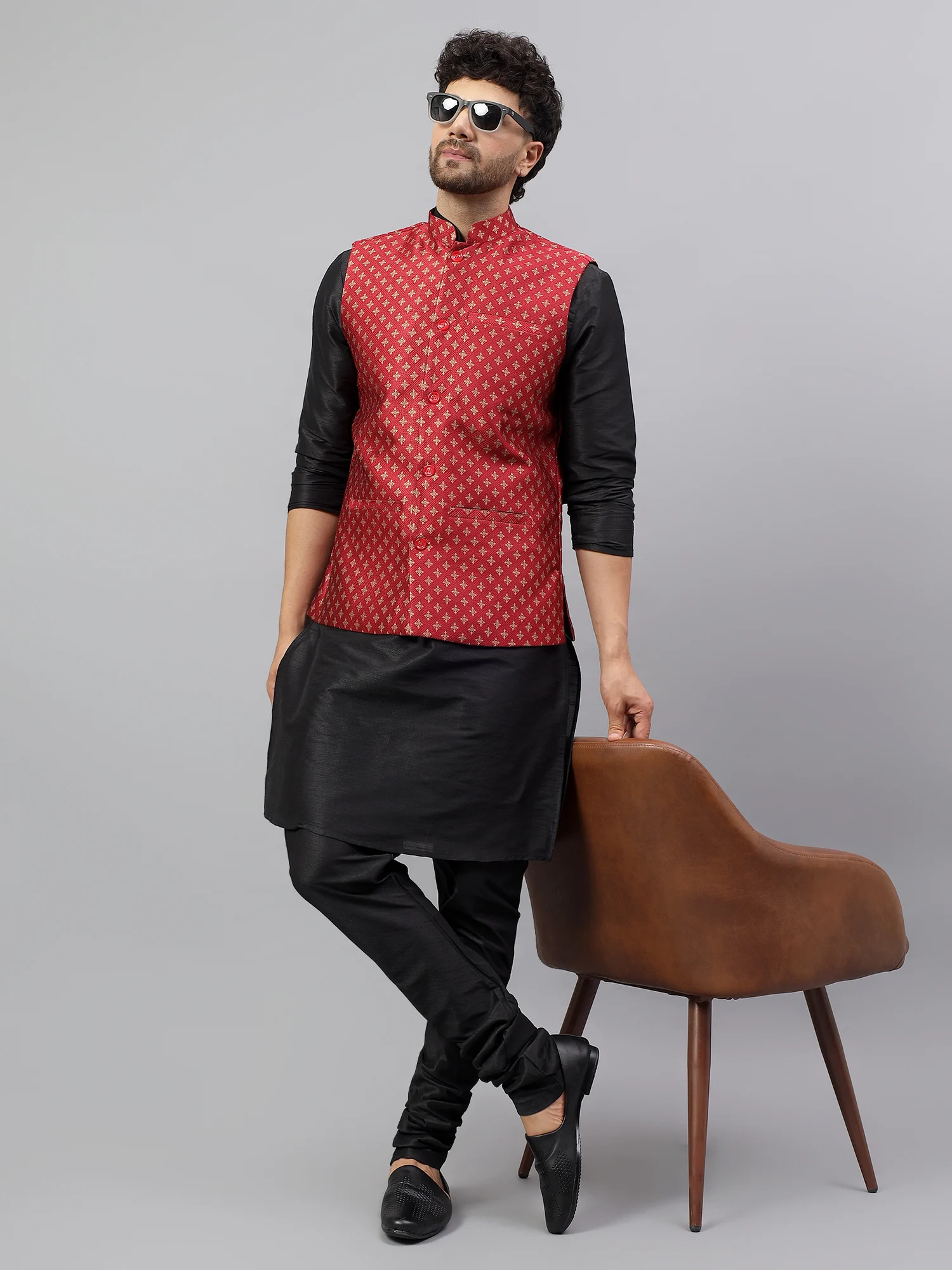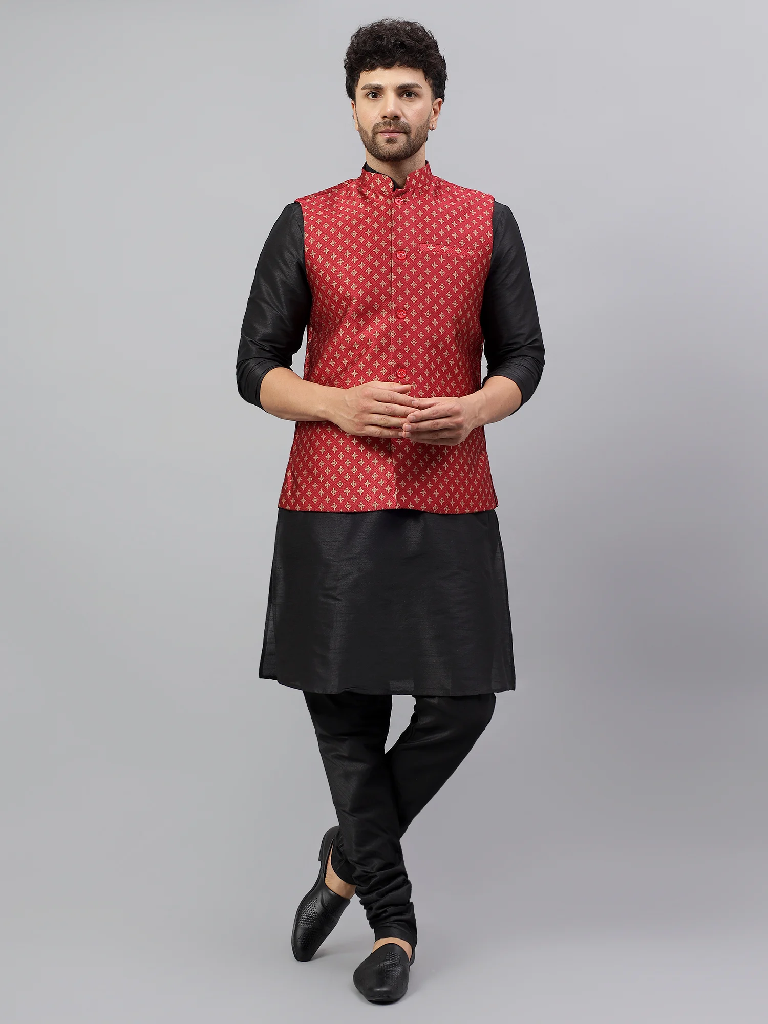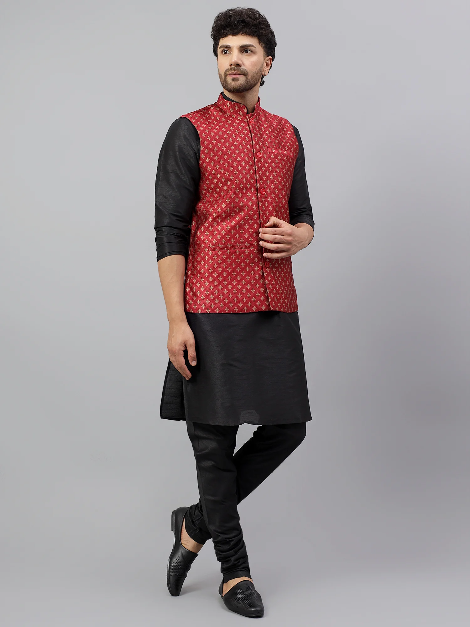Thank you for reading this post, don't forget to subscribe!Designed to offer both style and comfort, the jacket comes with a structured Mandarin collar and a front button placket with matching red buttons. The elegant cut, combined with functional welt pockets on the chest and waist, ensures a flattering fit and practical use. Perfectly suited for layering over kurtas or shirts, it’s an ideal choice for weddings, traditional festivals, family gatherings, and cultural functions.