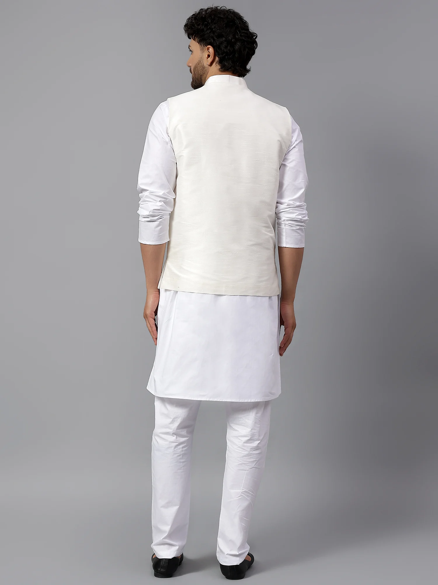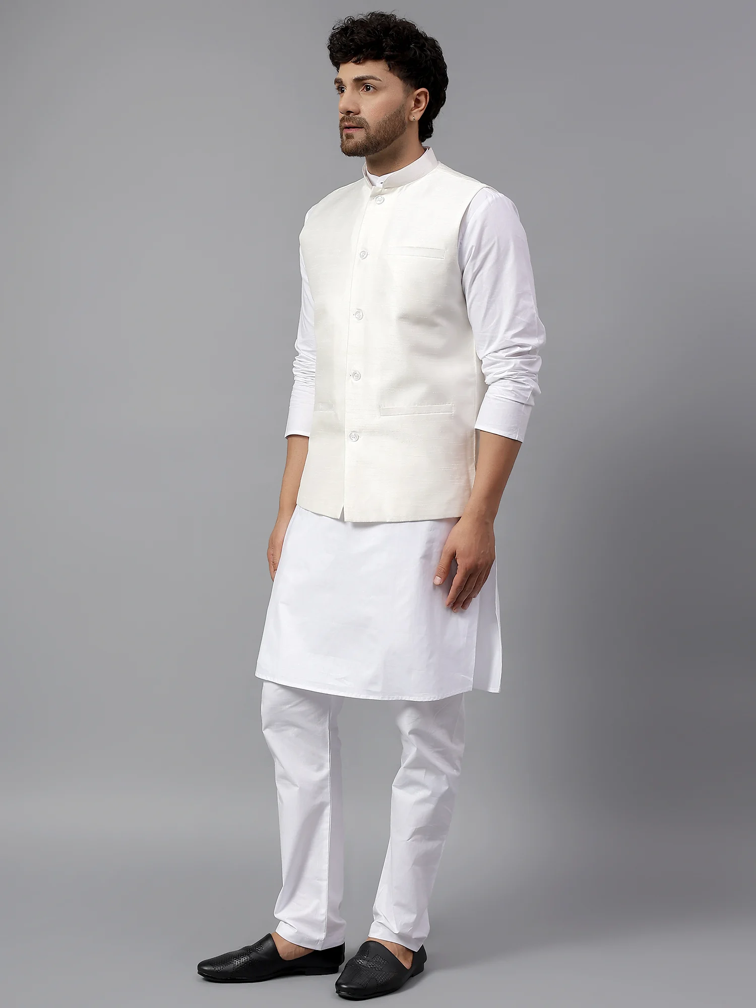 The off-white hue represents purity and class, making it the perfect layering piece over kurta-pajamas, pathani suits, or even Indo-western ensembles for weddings, festive occasions, or formal celebrations. It features a Mandarin collar, a sleek button-down front, and three welt pockets—blending ethnic aesthetics with modern tailoring.