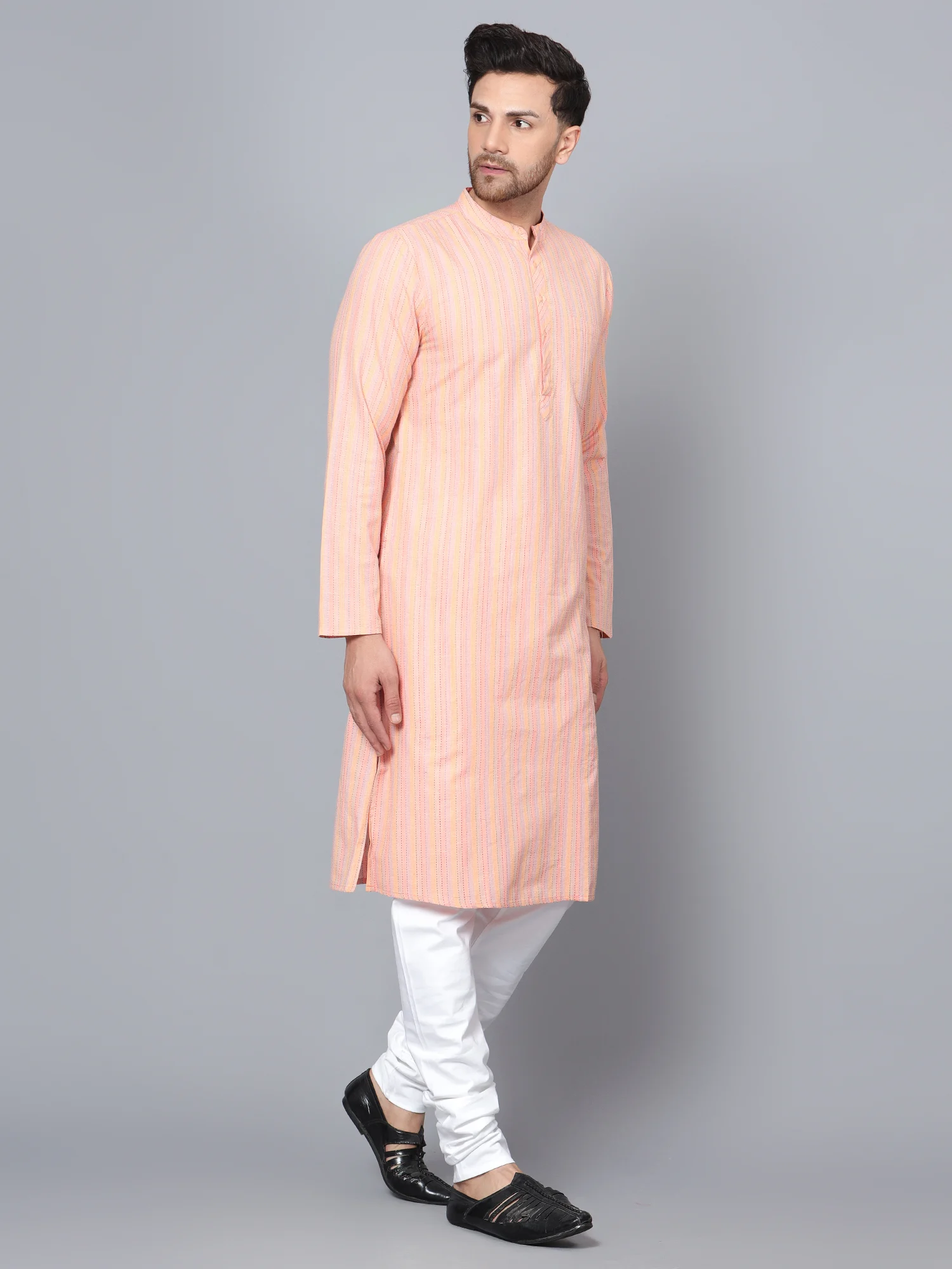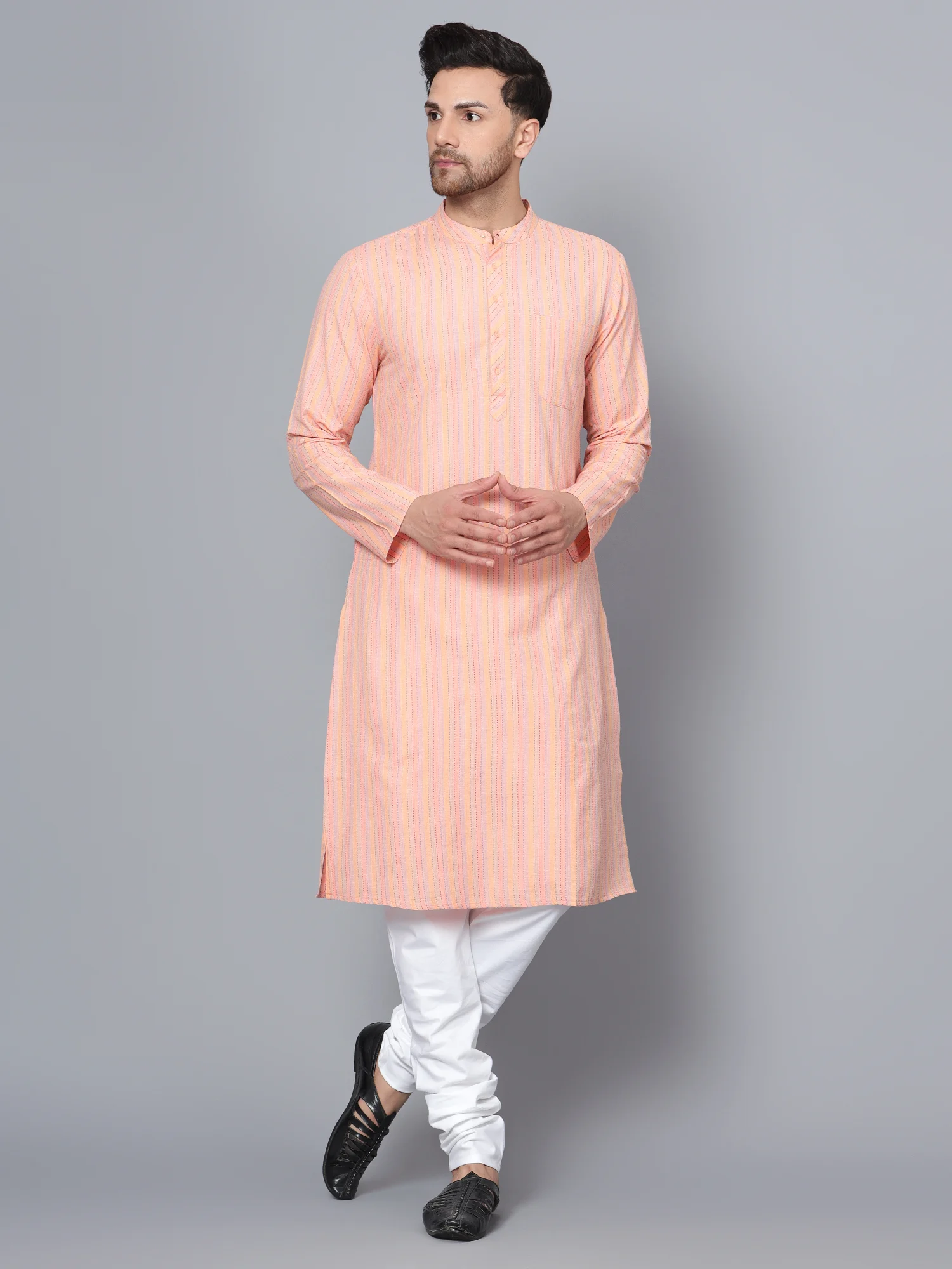 Add a touch of effortless sophistication to your ethnic look with this men’s Peach kurta. Made from breathable cotton fabric, it offers all-day comfort and a smart fit. The kurta features fine vertical multicolor thread stripes, a sleek mandarin collar, and a half-button placket that enhances its contemporary appeal. The chest pocket adds subtle functionality, while the lightweight texture ensures comfort in all seasons. Pair it with white churidar or pajama for a complete festive or casual ensemble.