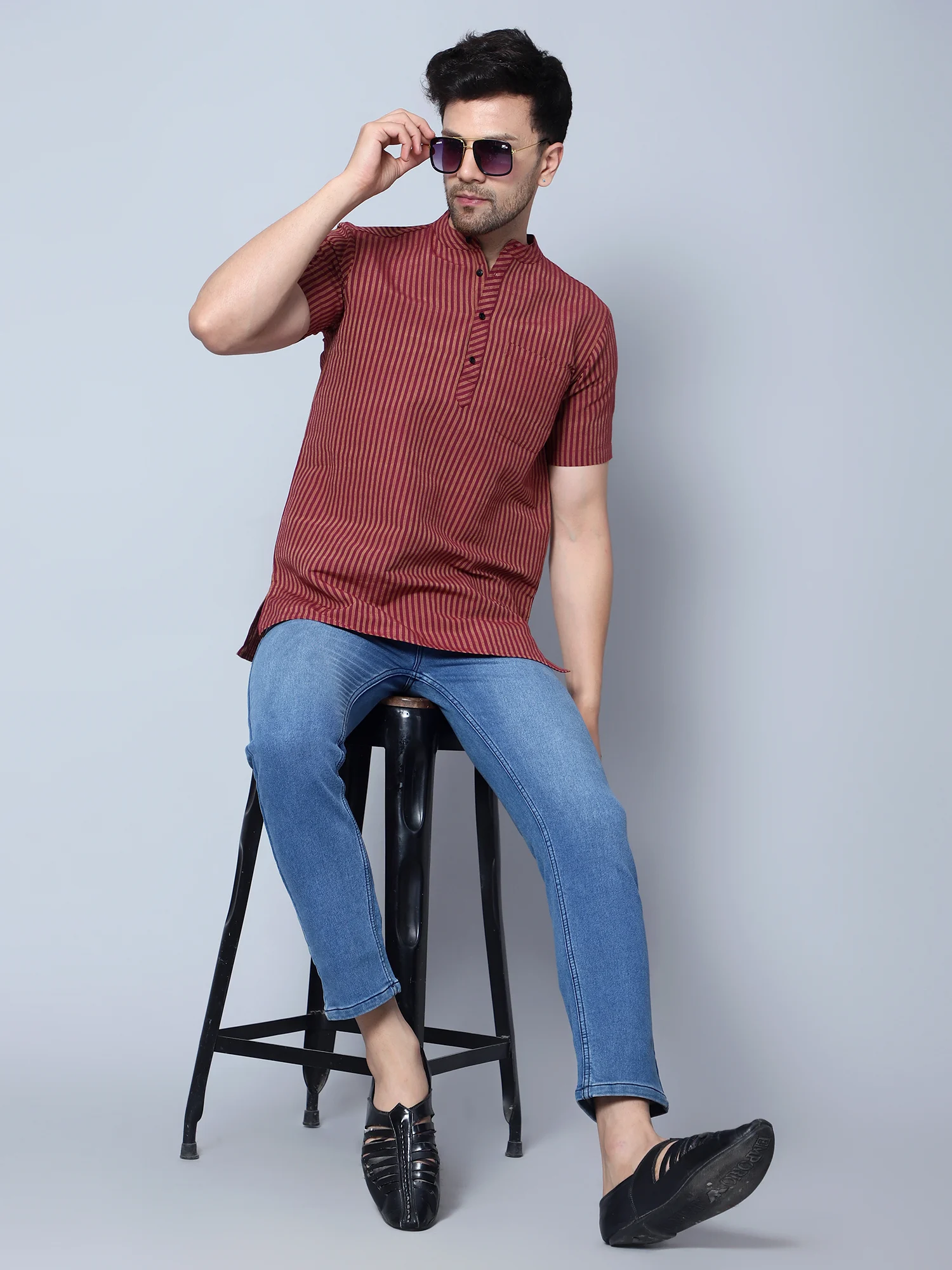 Elevate your ethnic-casual wardrobe with this Men’s Maroon & Brown Striped Cotton Short Sleeve Kurta, a perfect blend of tradition and trend. Crafted from high-quality, breathable cotton fabric, this kurta is designed for modern men who appreciate style with comfort.