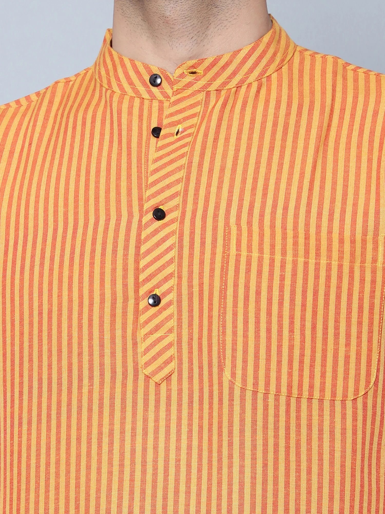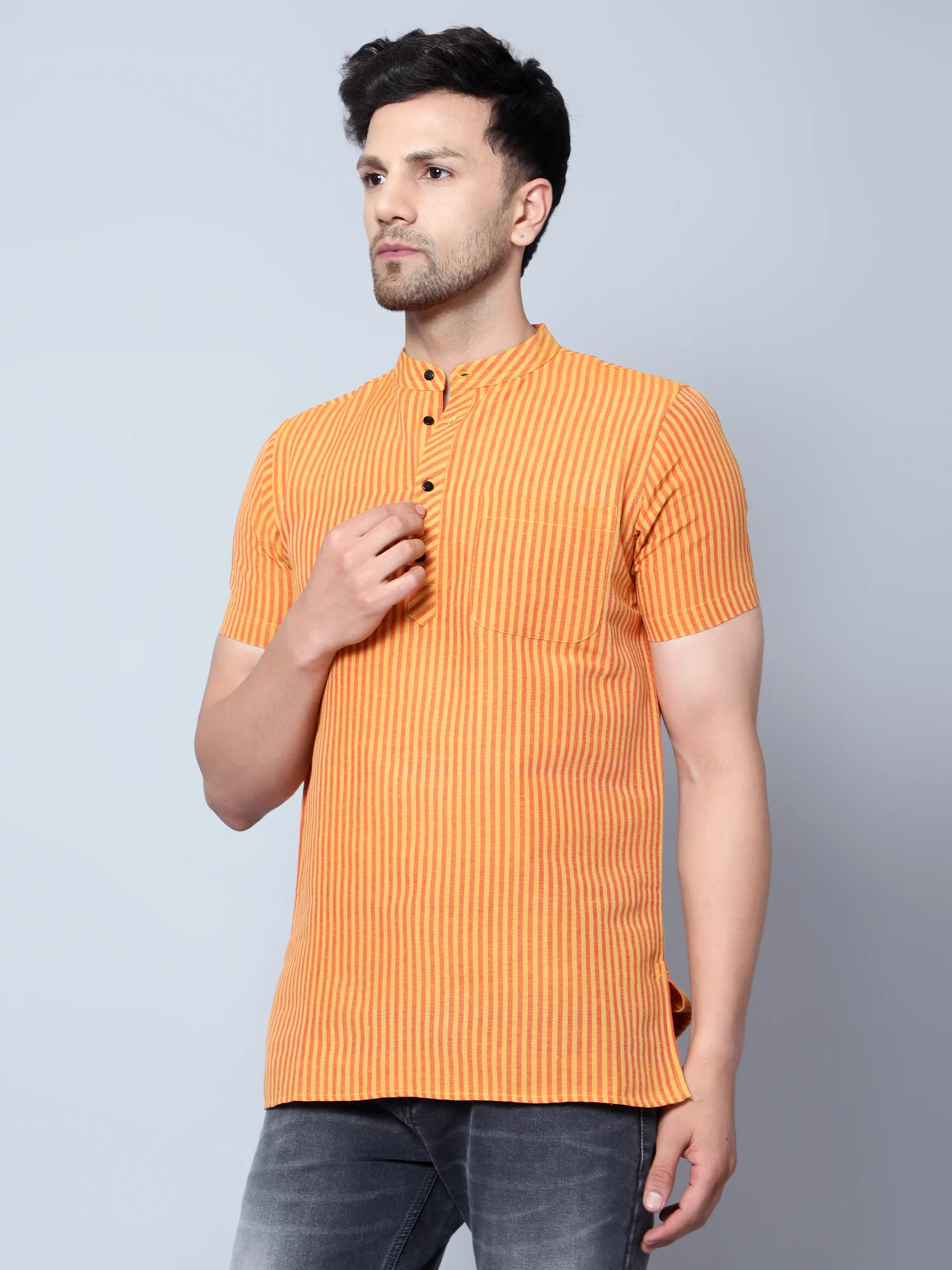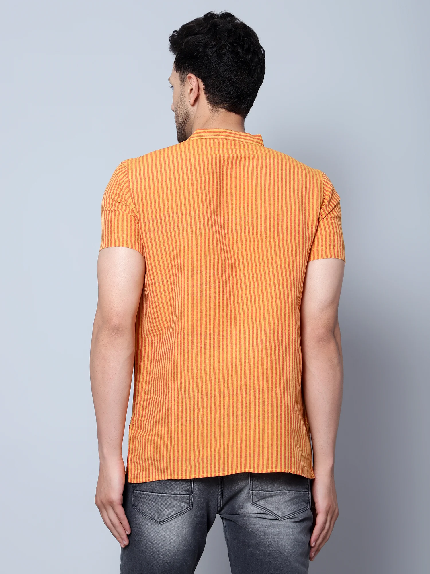 The vertical orange and red stripes add a striking contrast and elongate your silhouette, while the Mandarin collar and half-button placket bring a clean, contemporary edge. The short sleeves and side slits make it perfect for warmer weather or relaxed indoor settings. Pair it with denim, chinos, or traditional pajama bottoms for a stylish Indo-western look.