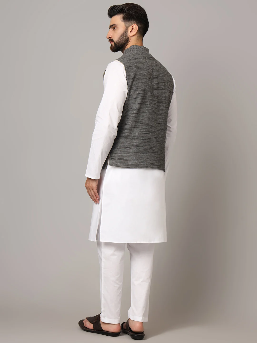 efine your ethnic or semi-formal look with this Charcoal Grey Nehru Jacket, tailored in a sleek, sleeveless design with a textured stripe pattern. The elegant mandarin collar and structured silhouette give it a polished appeal, while the handcrafted wooden buttons and functional pockets add both tradition and practicality. Layer it over a kurta or formal shirt for weddings, events, or festive gatherings.