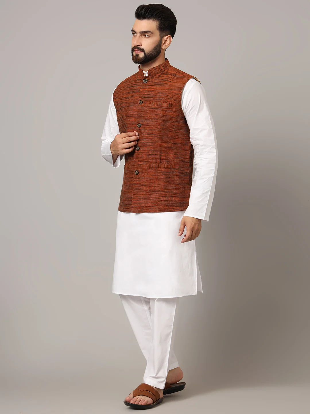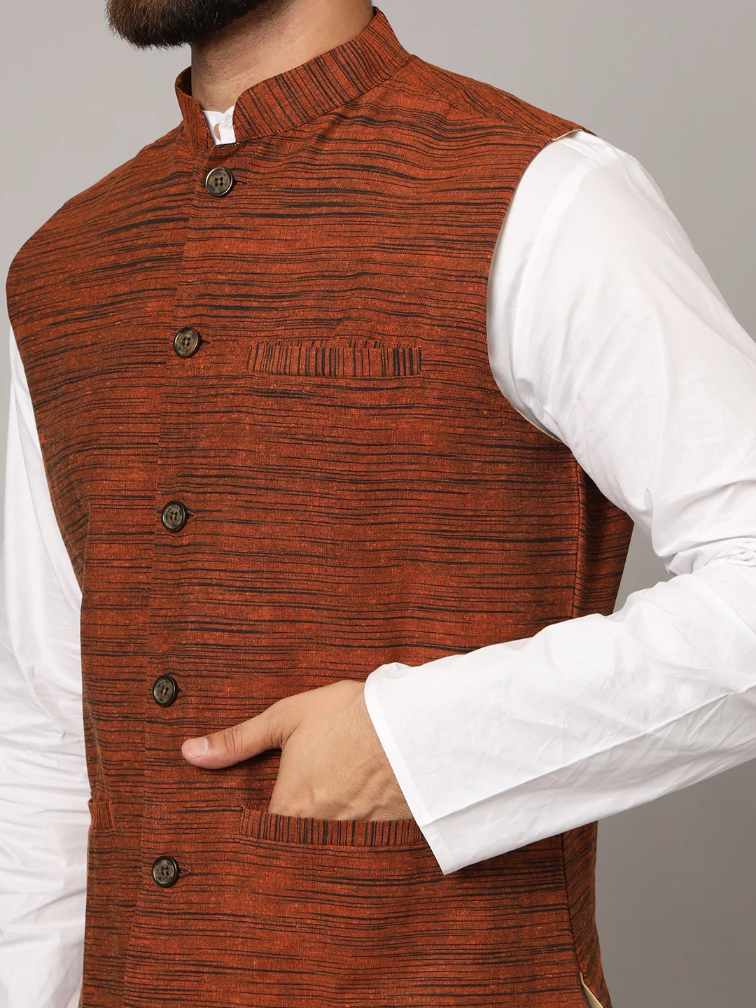 Add a bold yet refined touch to your ethnic collection with this Rust Brown Textured Nehru Jacket. Featuring a classic mandarin collar, elegant wooden buttons, and a distinctive horizontal stripe texture, this jacket is a stylish choice for festive gatherings, weddings, and cultural celebrations. The rich rust hue effortlessly blends modern flair with traditional elegance.