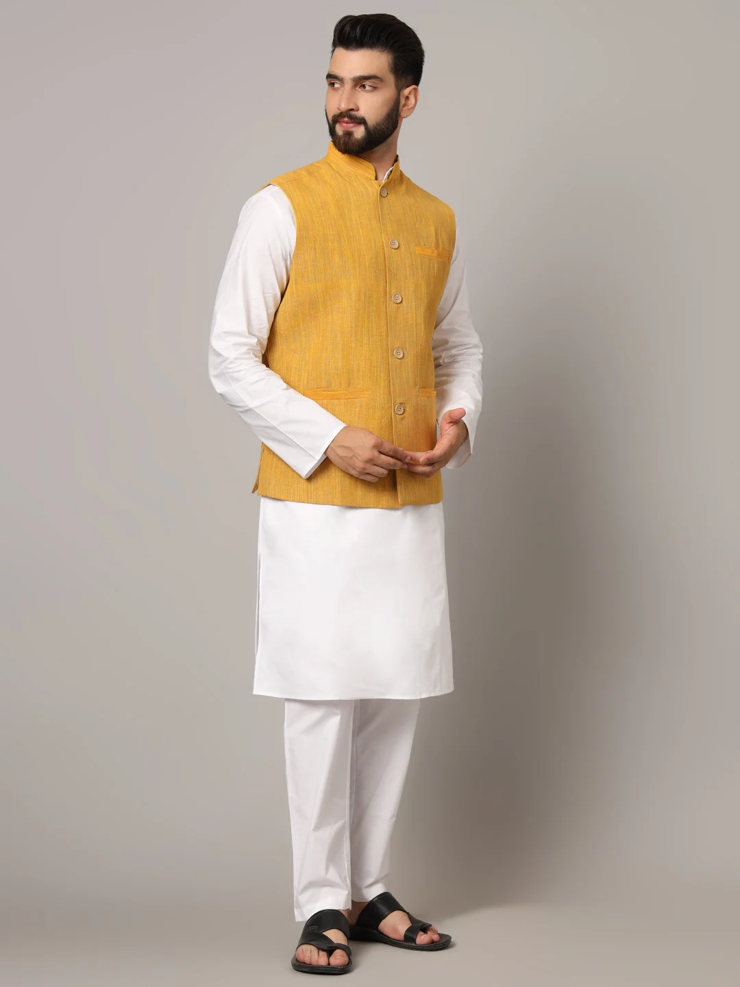 Step into tradition with a modern twist in the Hazim Men’s Mustard Yellow Nehru Jacket. Tailored from textured fabric, this sleeveless jacket features a Mandarin collar, wooden buttons, and a sleek fit that enhances your ethnic look. Ideal for festivals, weddings, and cultural celebrations, this versatile piece adds a vibrant pop to any outfit.